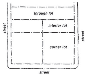 Through lots. Through lots are lots that have frontage on two streets, but not on a corner. Through lots are allowed only where the primary front lot line is on a local service street. The minimum front lot line and minimum width standards apply to one frontage of the through lot.