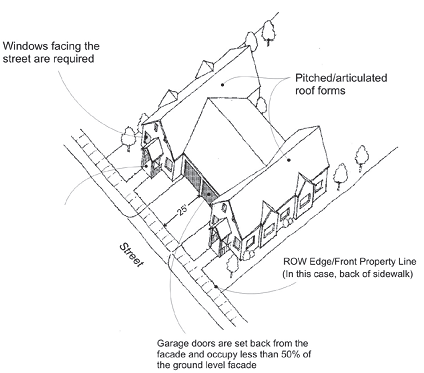 Garages should not occupy more than 50 percent of the building facade as seen from the front property line.