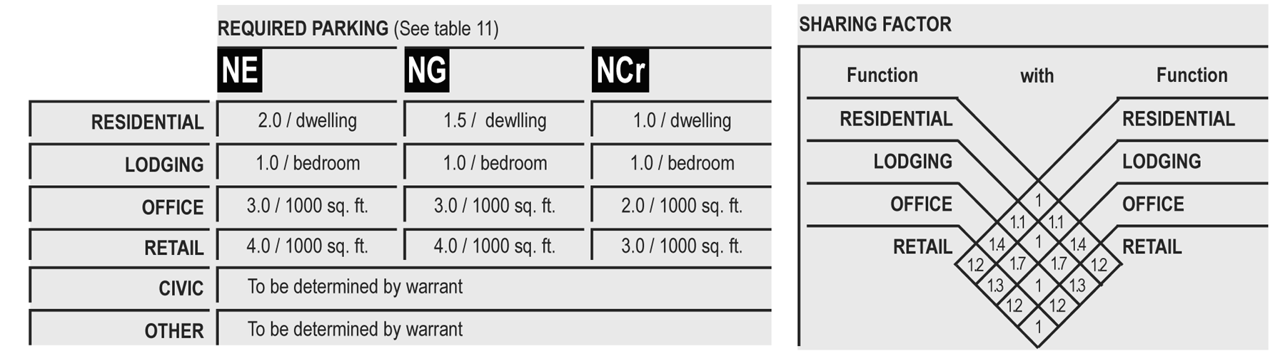 Shared parking: An accounting for parking spaces that are available to more than one function. The requirement is reduced by a factor, shown as a calculation. The shared parking ratio varies according to multiple functions in close proximity which are unlikely to require the spaces at the same time (see Tables 11 and 12).