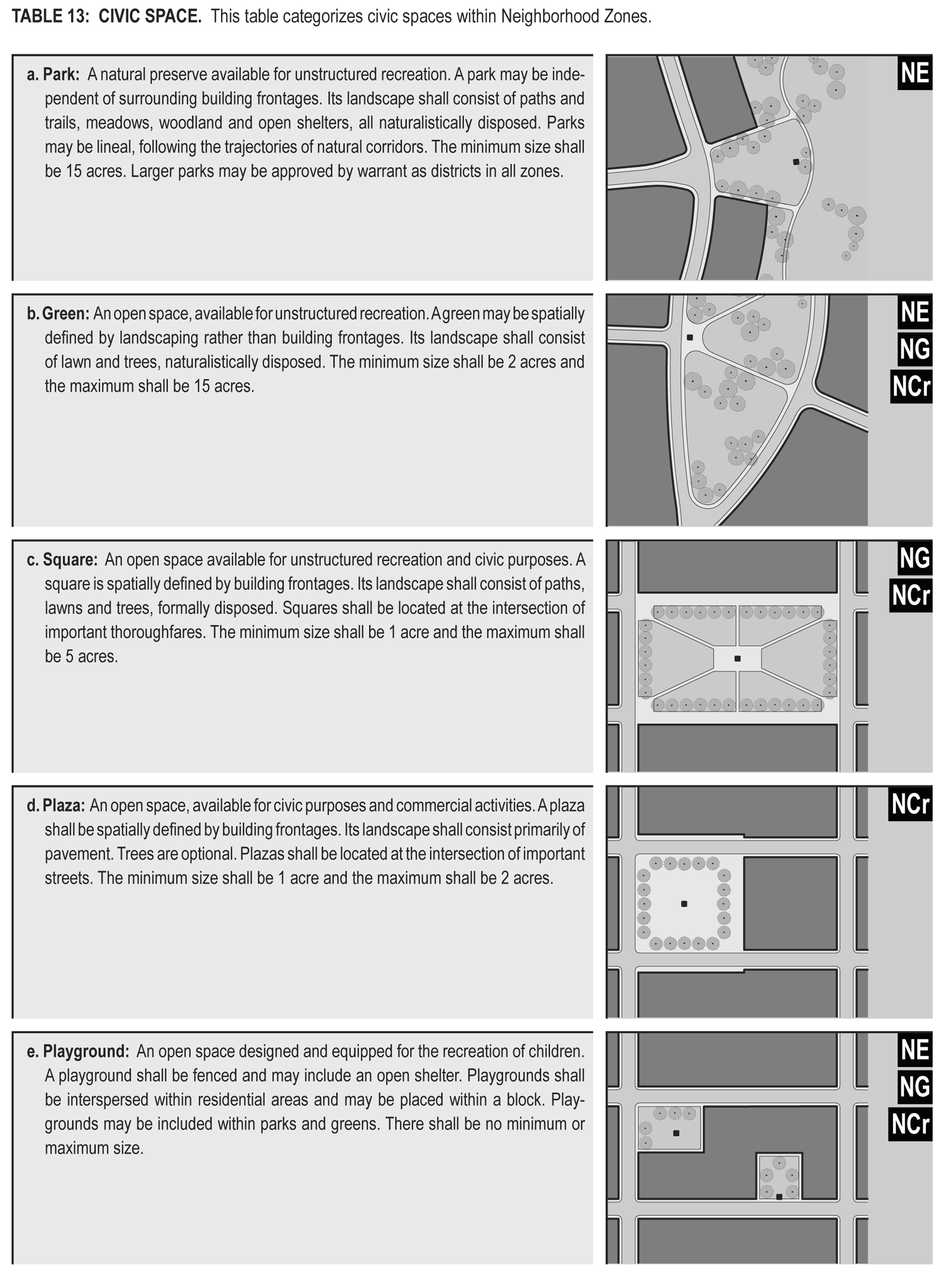 Civic space: An outdoor area dedicated for public use. Civic space types are defined by the combination of certain physical constants including the relationship between their intended use, their size, their landscaping and their enfronting buildings (see Table 13).