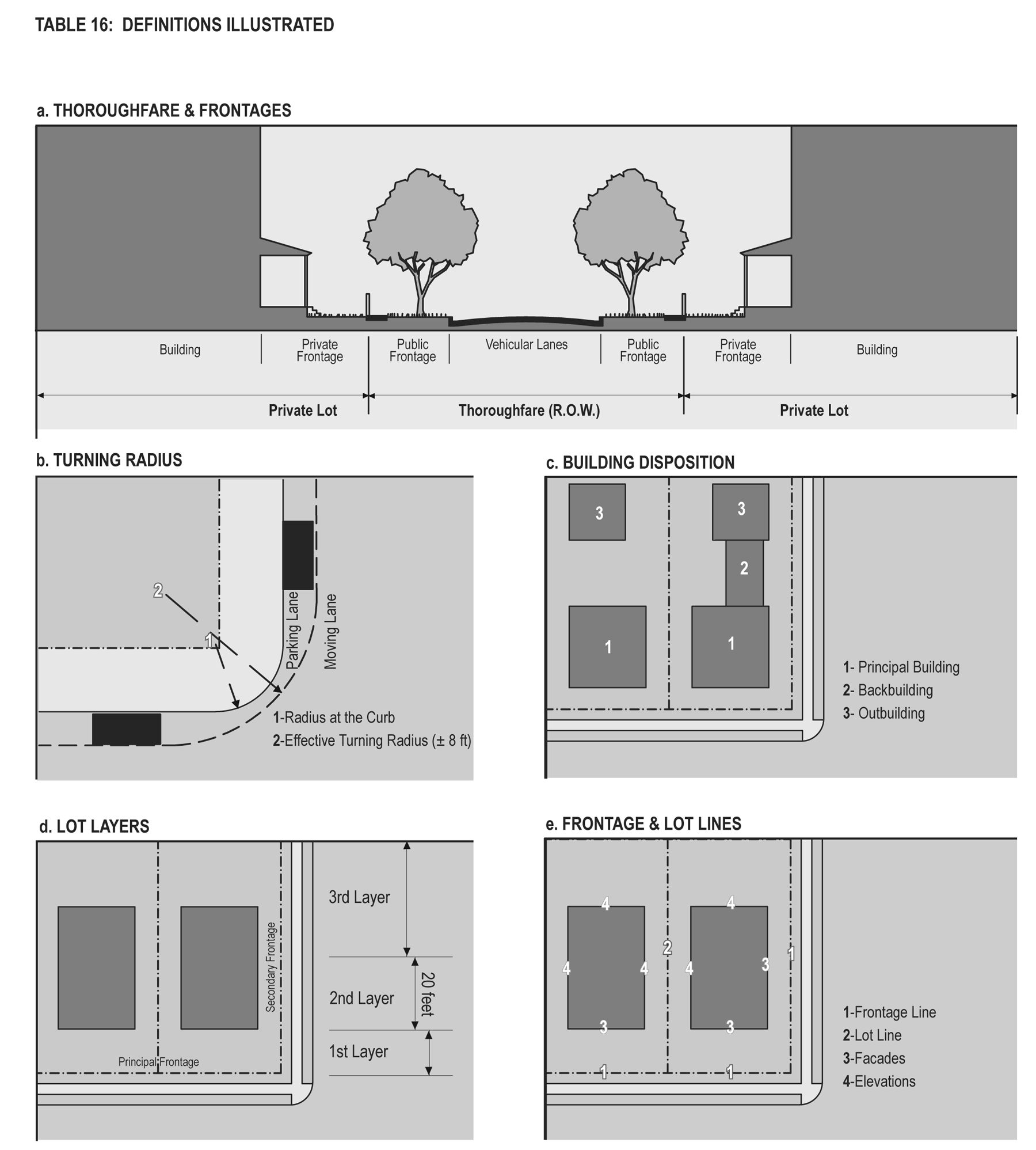 Frontage line: Those lot lines that coincide with a public frontage. Facades along frontage lines define the public realm and are therefore more regulated than the elevations that coincide with other lot lines (see Table 16).