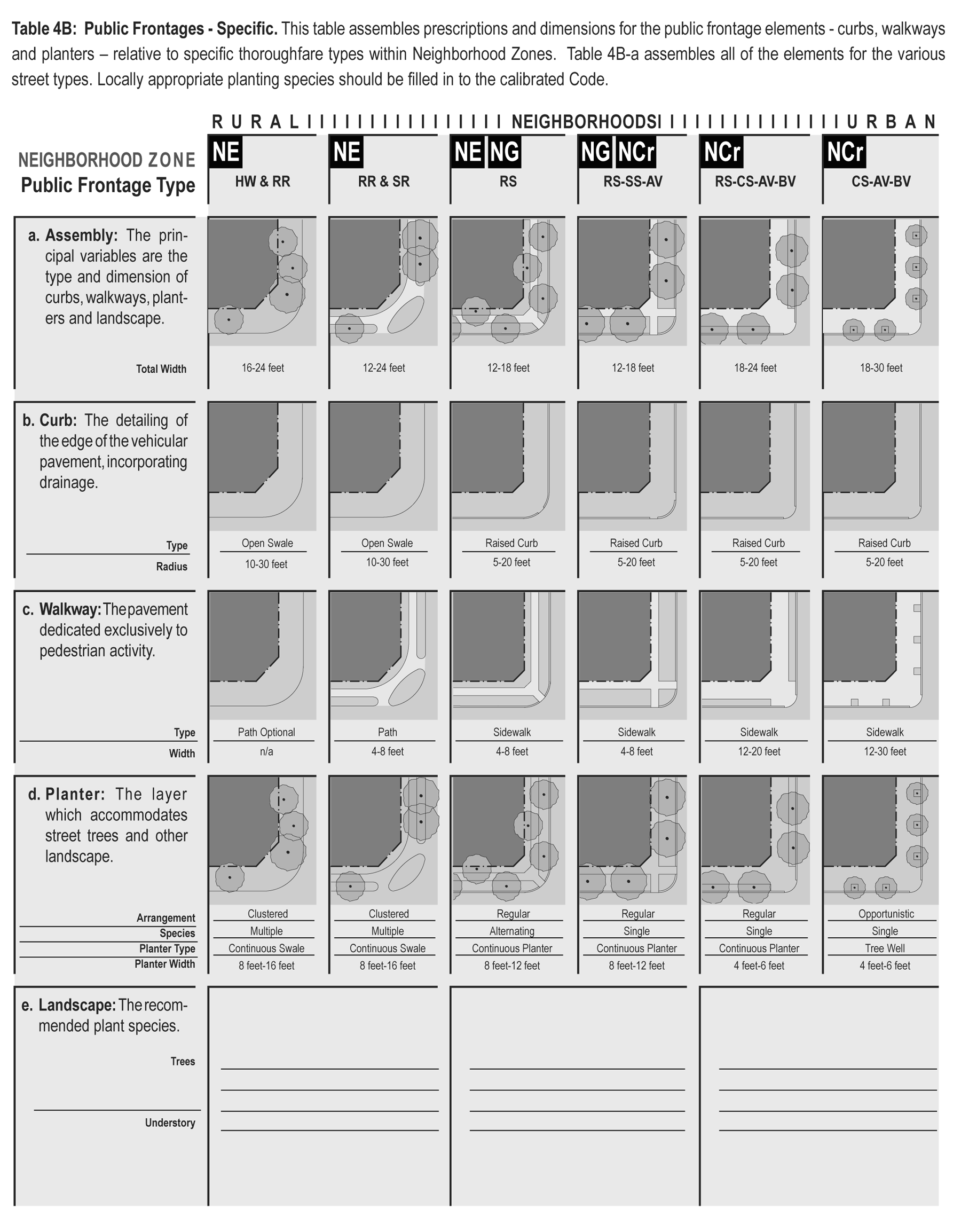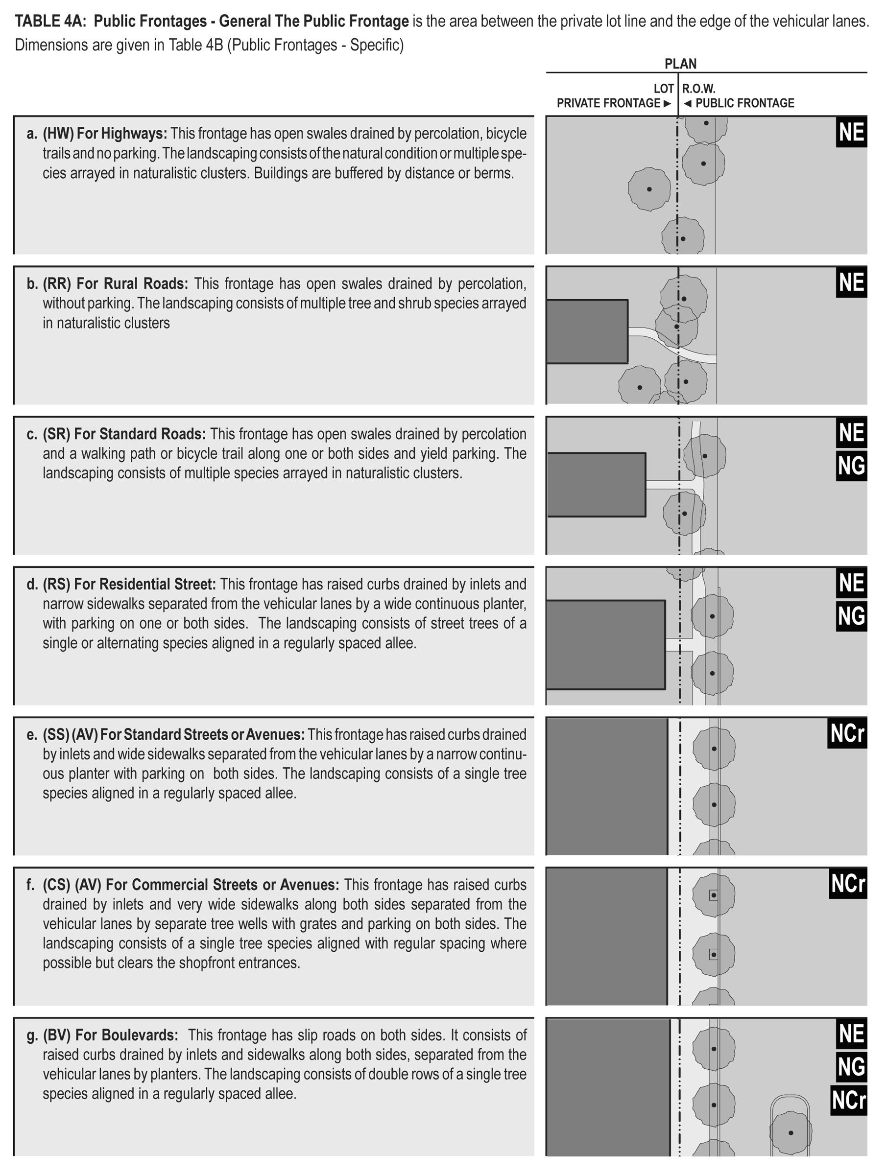 Public frontage: The area between the curb of the vehicular lanes and the frontage line. Elements of the public frontage include the type of curb, walk, planter, street tree and streetlight (see Table 4).