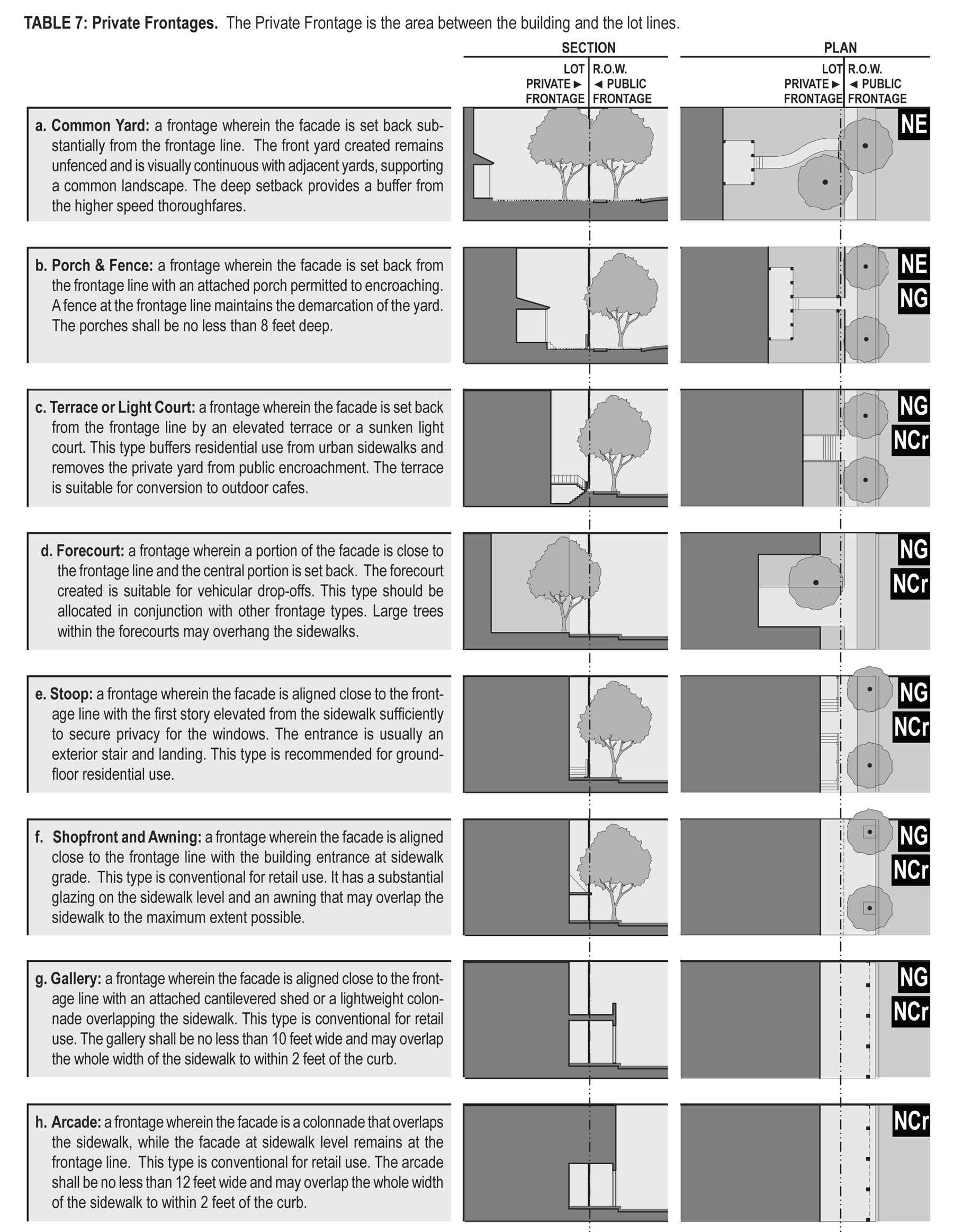 Private frontage: The privately held layer between the frontage line and the principal building facade. The structures and landscaping within the private frontage may be held to specific standards. The variables of private frontage are the depth of the setback and the combination of architectural elements such as fences, stoops, porches and galleries (see Table 7).