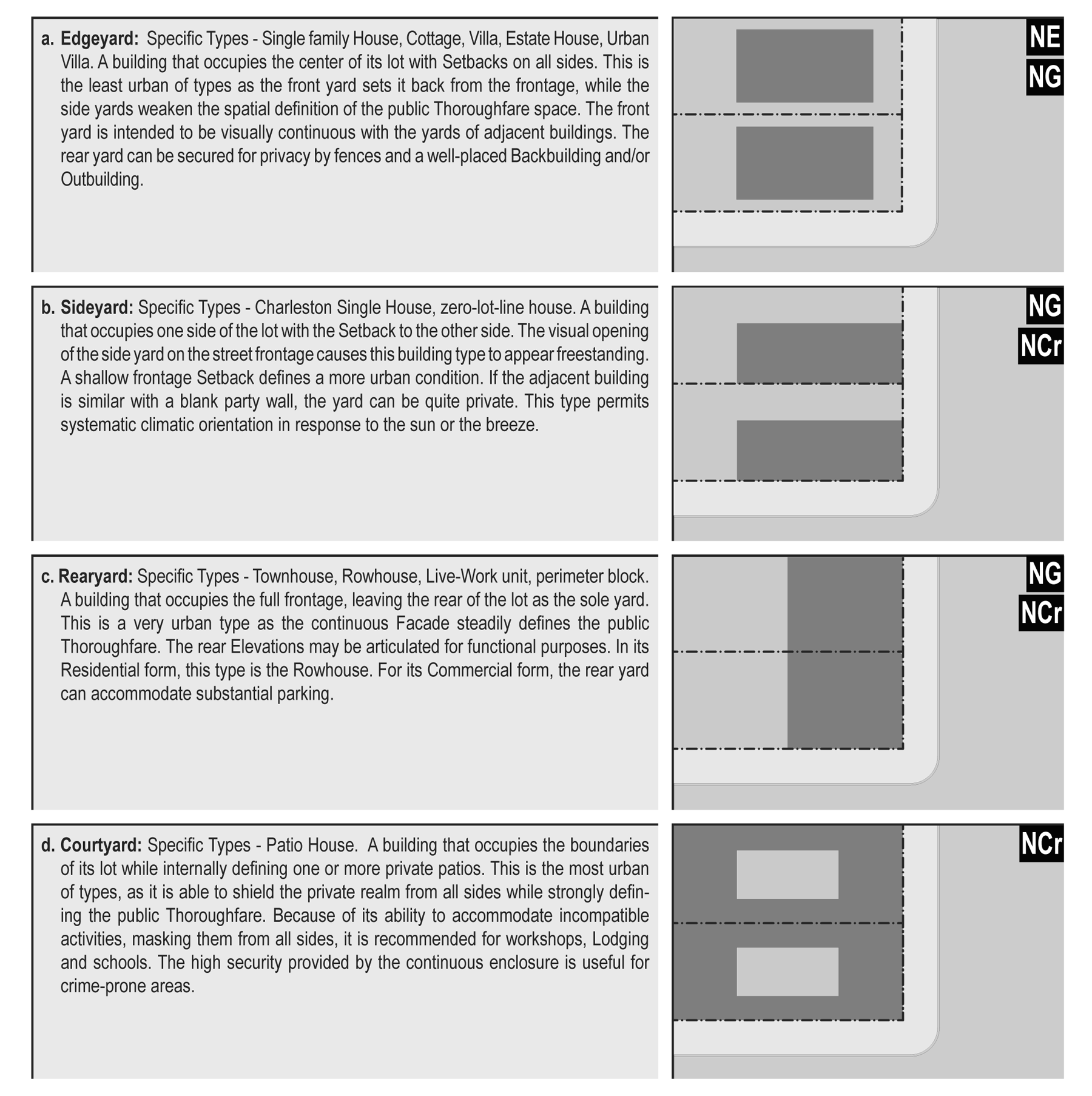Rearyard building: A building that occupies the full frontage line, leaving the rear of the lot as the sole yard. This is a more urban type, as the continuous facade spatially defines the public thoroughfare. For its residential function, this type yields a rowhouse. For its commercial function, the rear yard can accommodate substantial parking.