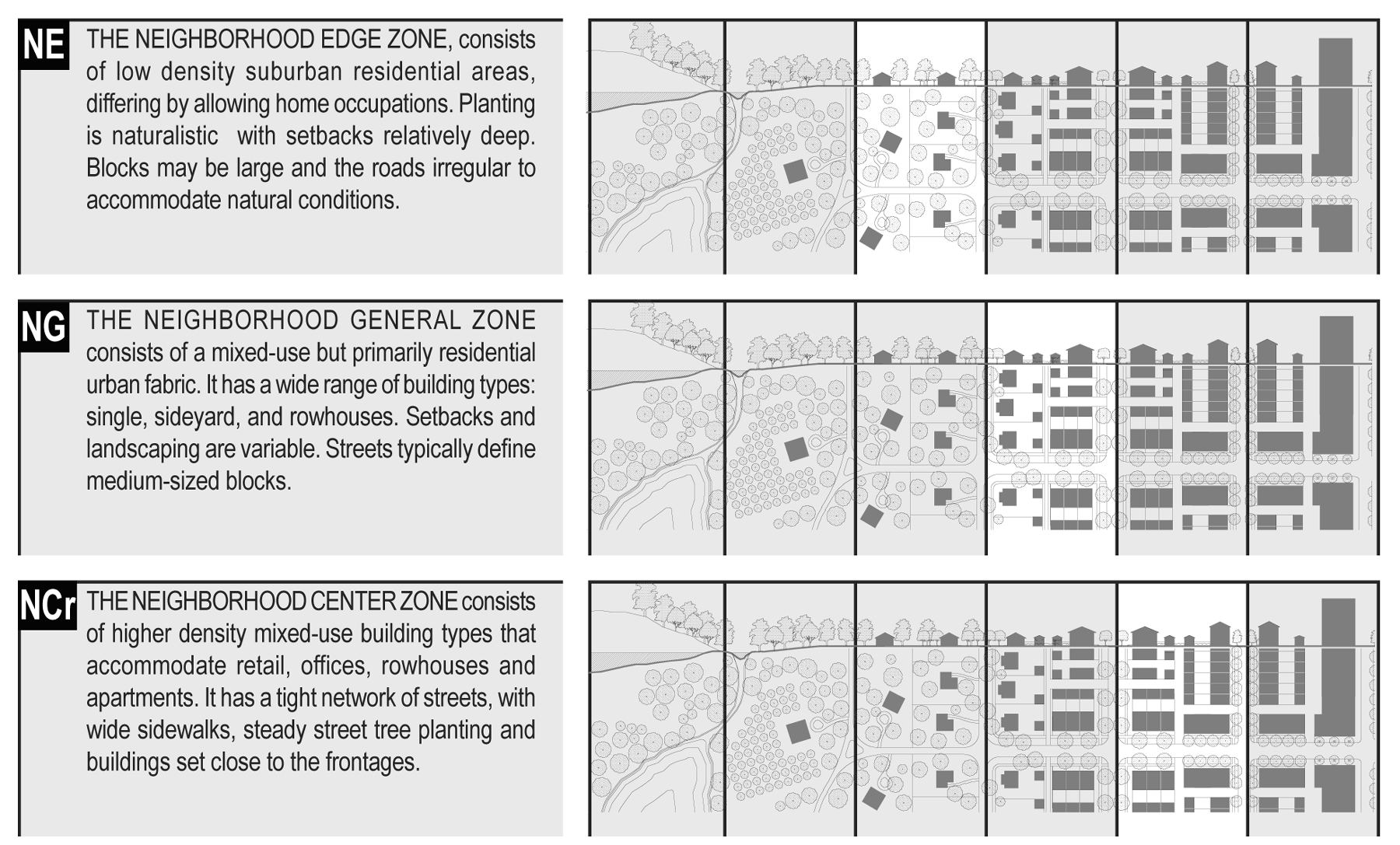 8.4.2 Neighborhoods shall be planned according to the provisions of this Code and shall be of the neighborhood zones described herein.