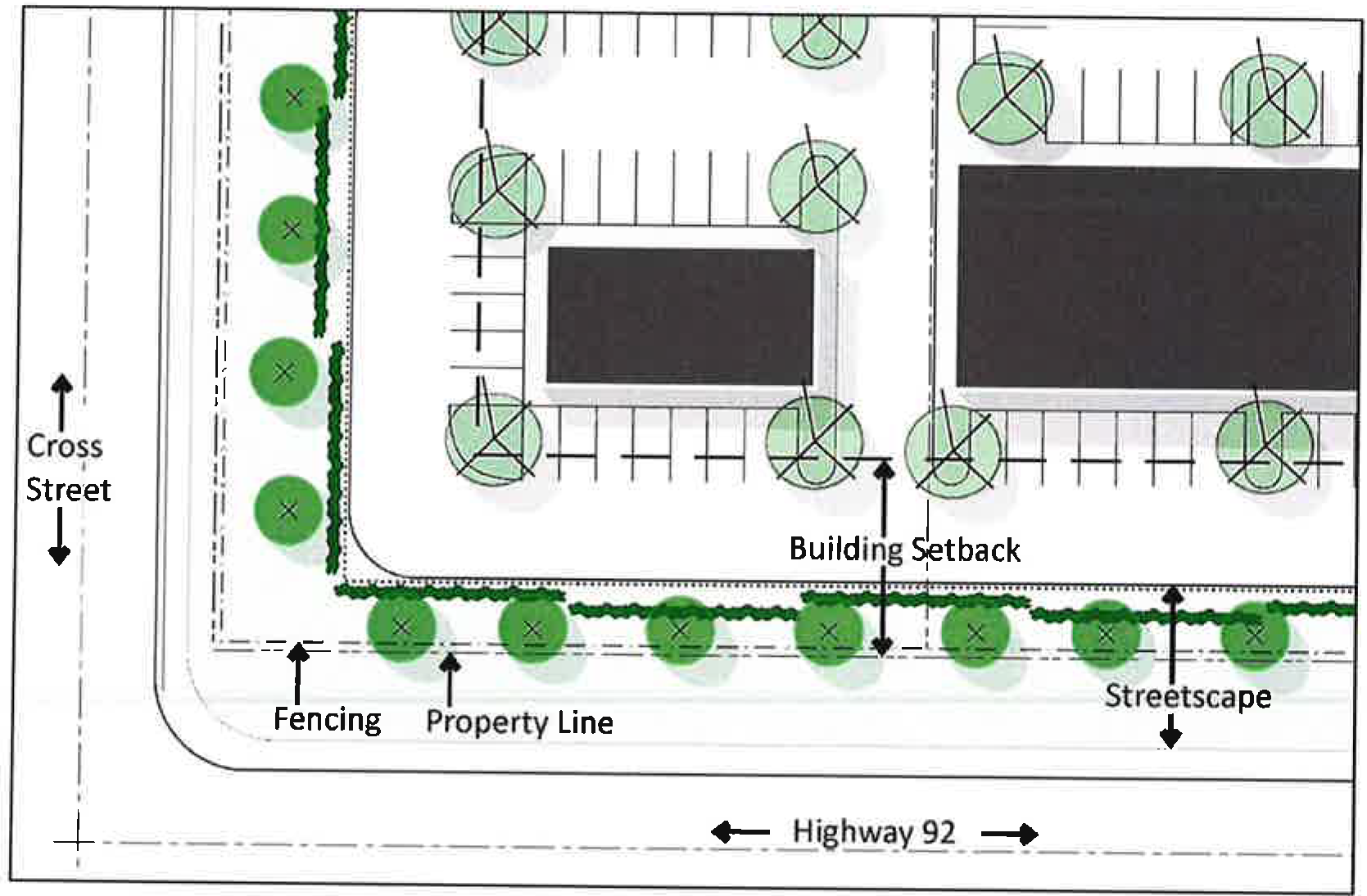 A landscaped berm of no less than three feet in height or evergreen landscape planting no less than three feet in height at the time of planting shall be provided to screen vehicular parking areas, loading areas, and dumpsters from view from Highway 92.