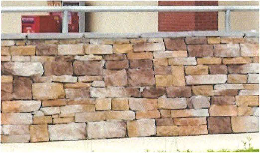 Buildings shall have no less than 80 percent of the non-glass area of three exterior sides faced with natural-colored brick or stone that simulates historic types of masonry.