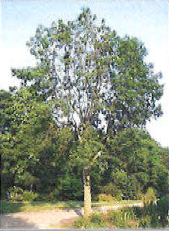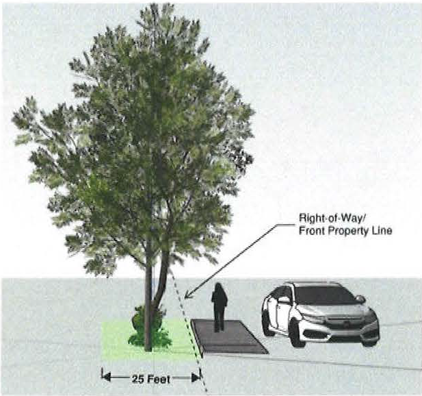 An overstory tree not less than three inches DBH as indicated in the Tree Ordinance shall be planted every 40 feet on center along the entire roadway frontage of the property within the landscape strip.