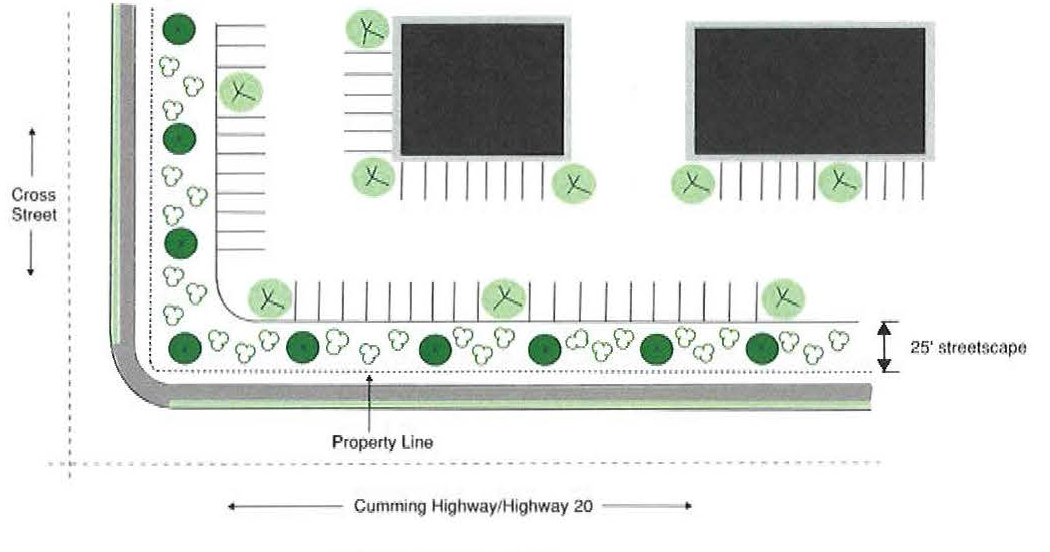The corners of street intersections, particularly gateways and site entries, should be distinguished by landscape accent treatments, such as but not limited to ground cover, herbaceous ornamentals, shrubs, understory, and/or overstory trees,