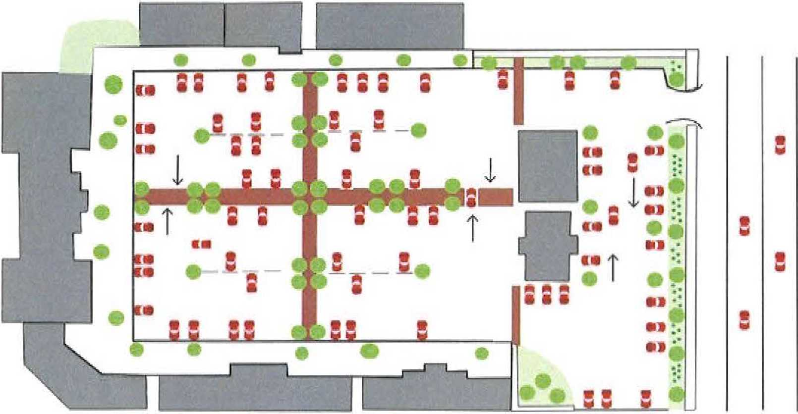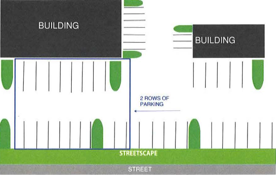 Parking areas shall be distributed around the site, rather than being concentrated in large lots, unless these lots are screened from the public right-of-way by buildings or vegetation. A maximum of two rows of parking may be located between the primary structure and any streets. All other surface parking shall be located to the side or rear of the building.