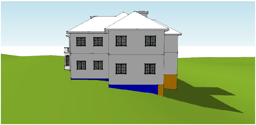 Basement, standard means any interior floor area having a ceiling height of at least six (6) feet and bounded by an exterior wall that is not exposed more than four (4) feet above the adjacent finished grade, or by the standard basement's interior boundary, which is a vertical plane that connects two (2) vertical lines on the outer walls that are located at the point where the exterior wall is exposed at a height of four (4) feet. See Illustration: Standard Basement Versus Walkout Basement.