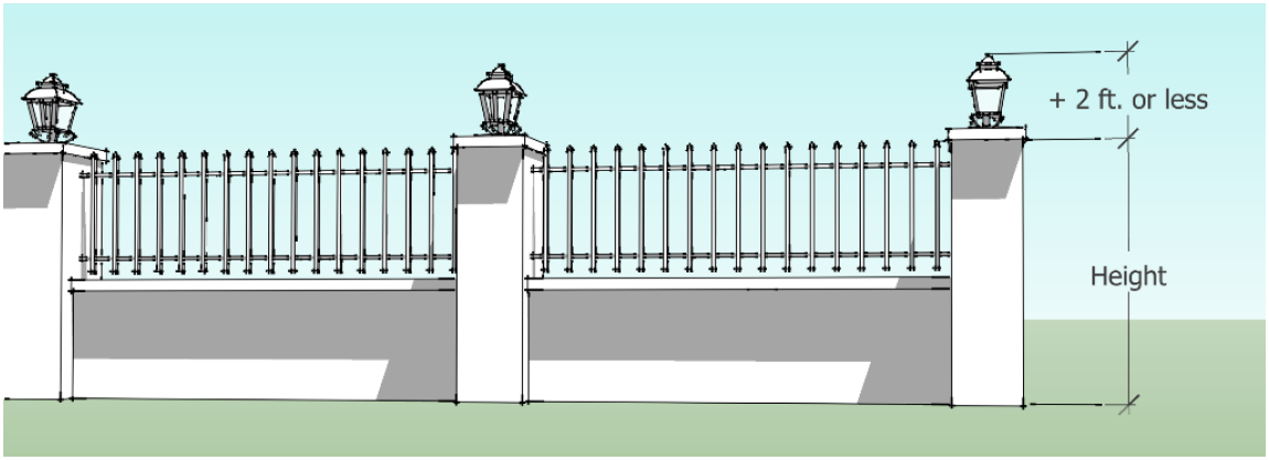 Exceptions. Neither a column nor a light fixture attached to a column shall be included within the calculation of the height of a fence so long as the height of the column, or combination of the height of the column and the light fixture, is not more than two (2) feet greater than the otherwise applicable height limitations for the fence, and the columns that exceed the otherwise applicable height limitations are spaced at least six (6) feet apart.
