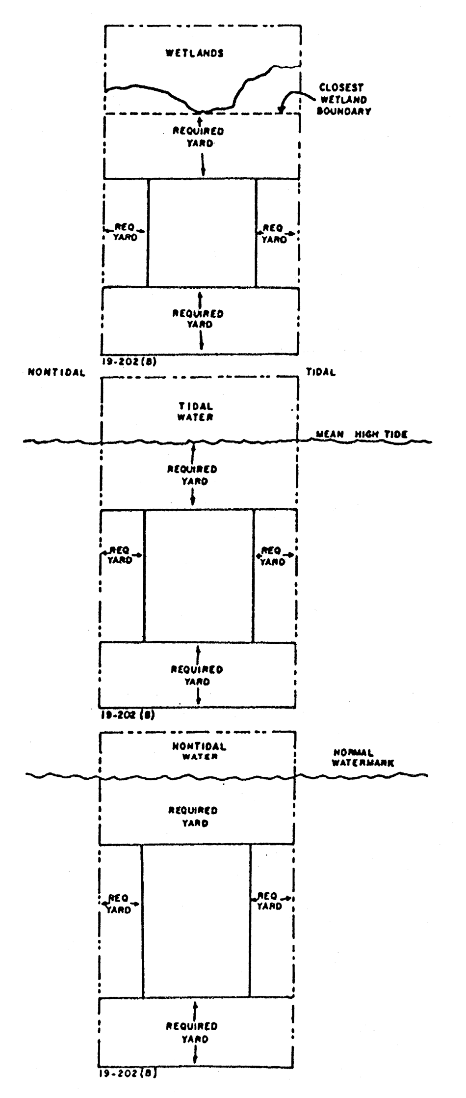 Measuring yards and setbacks from lot lines. Required yards shall be measured from the property line of the lot in question, at the distance specified for the zoning district classification in which the lot is located, except in the following circumstances: where wetlands, as defined in the Code of Virginia, 1950, as amended, extend onto the lot, the required yard shall be measured from the closest boundary of the wetlands; where a nontidal body of water extends onto the lot, the required yard shall be measured from the normal watermark.