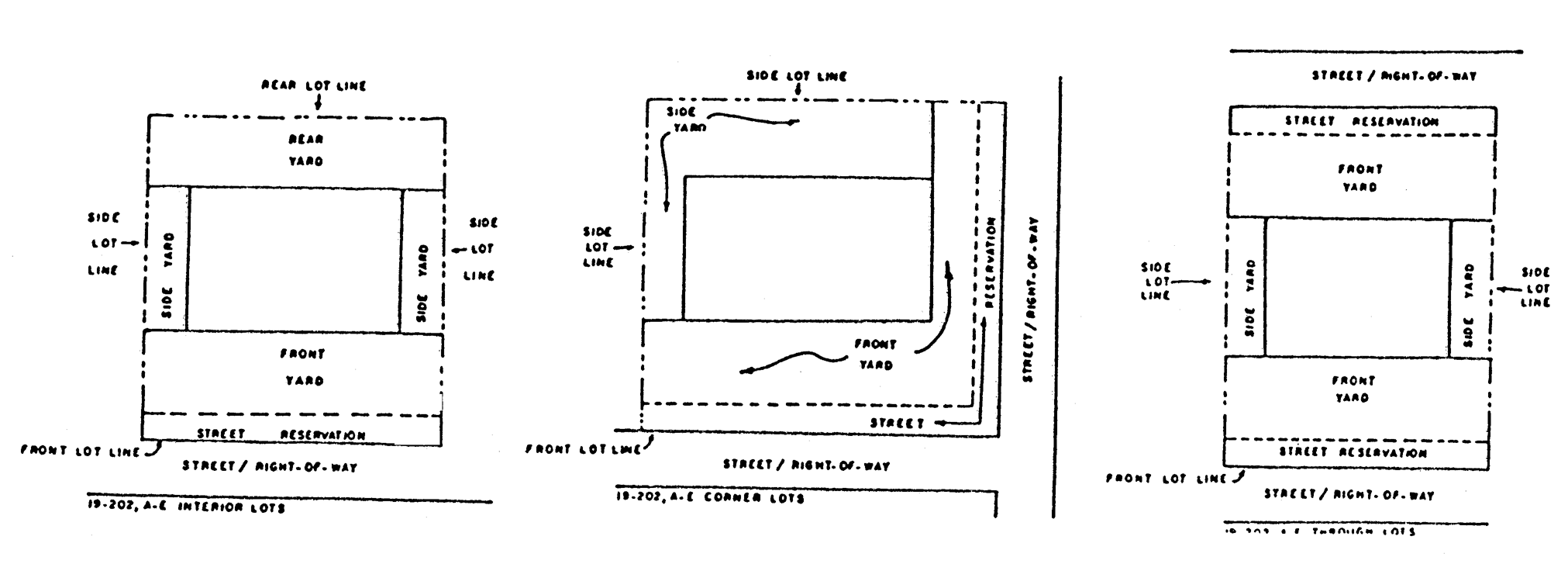 In the case of through lots and corner lots, there will be no rear yards, but only front and side yards.