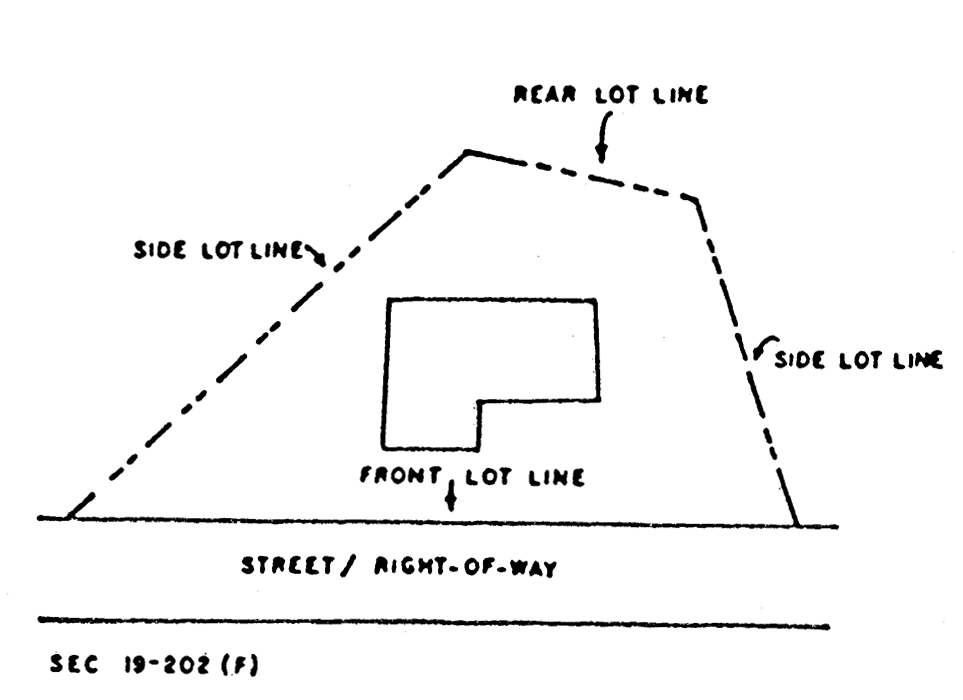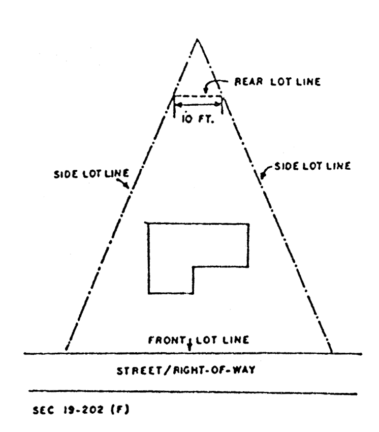 Where the side lot lines of a lot join together in a point creating a rear yard that is triangular in shape, the rear lot line of the lot, for purposes of determining minimum yard setbacks, shall be a line drawn parallel to the front lot line at a point where the distance between the side lot lines is at least ten (10) feet.