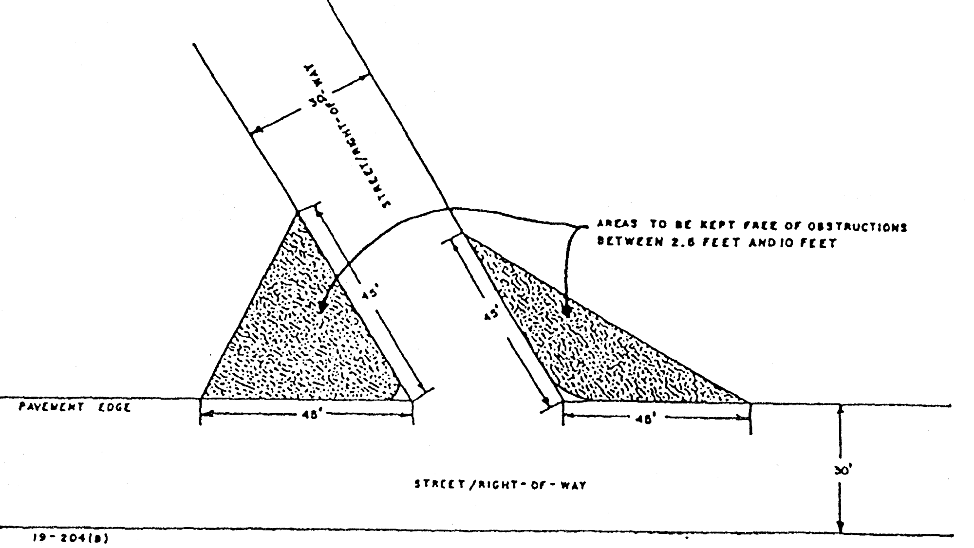 At intersections (corner lots). On a corner lot no fence, wall, hedge or other planting or structure that will obstruct vision between a height of two and one-half feet and ten feet above the pavement centerline grades of the intersecting streets shall be erected, placed or maintained within the triangular area formed by the edge of the pavement of each intersecting street at such corner lot and a straight line which joins those pavement edges at points which are forty-five (45) feet from the point where the projections of the pavement edges intersect.