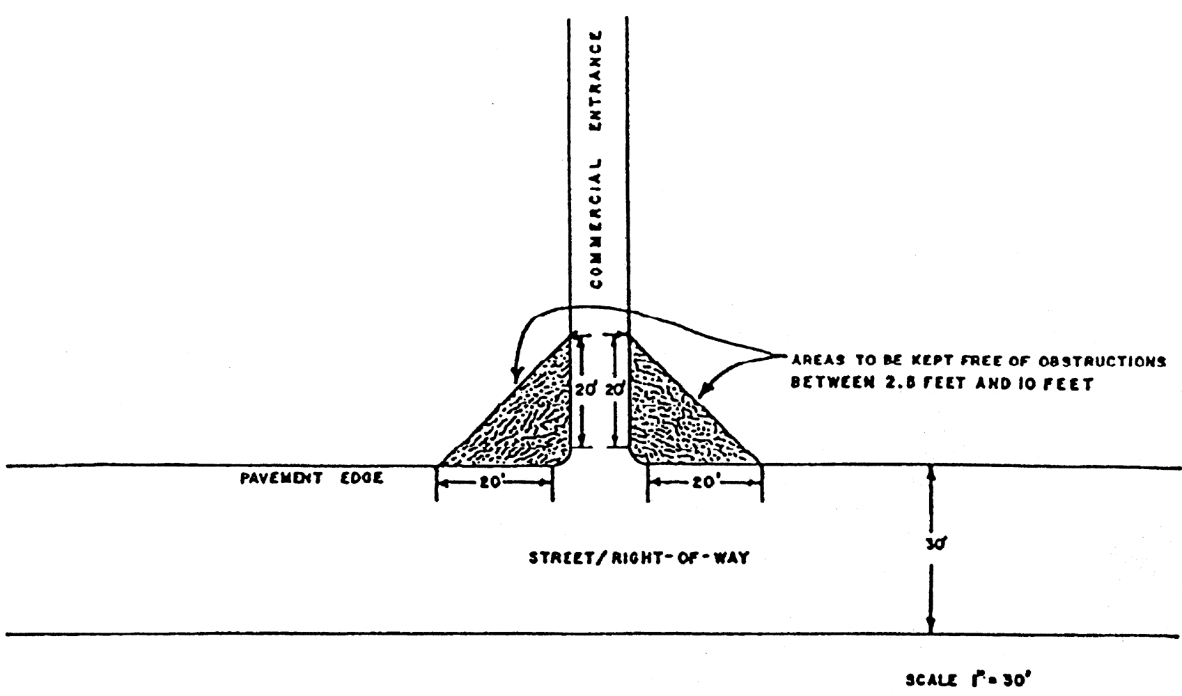 At commercial entrances. Visibility clearance shall also be required at all entrances onto public or private streets from properties zoned or used for office and institutional, business, industrial, multifamily and similar purposes, provided that the two equal sides of the triangle forming this visibility clearance area may be twenty (20) feet in length, rather than the forty-five (45) feet required for street intersections.
