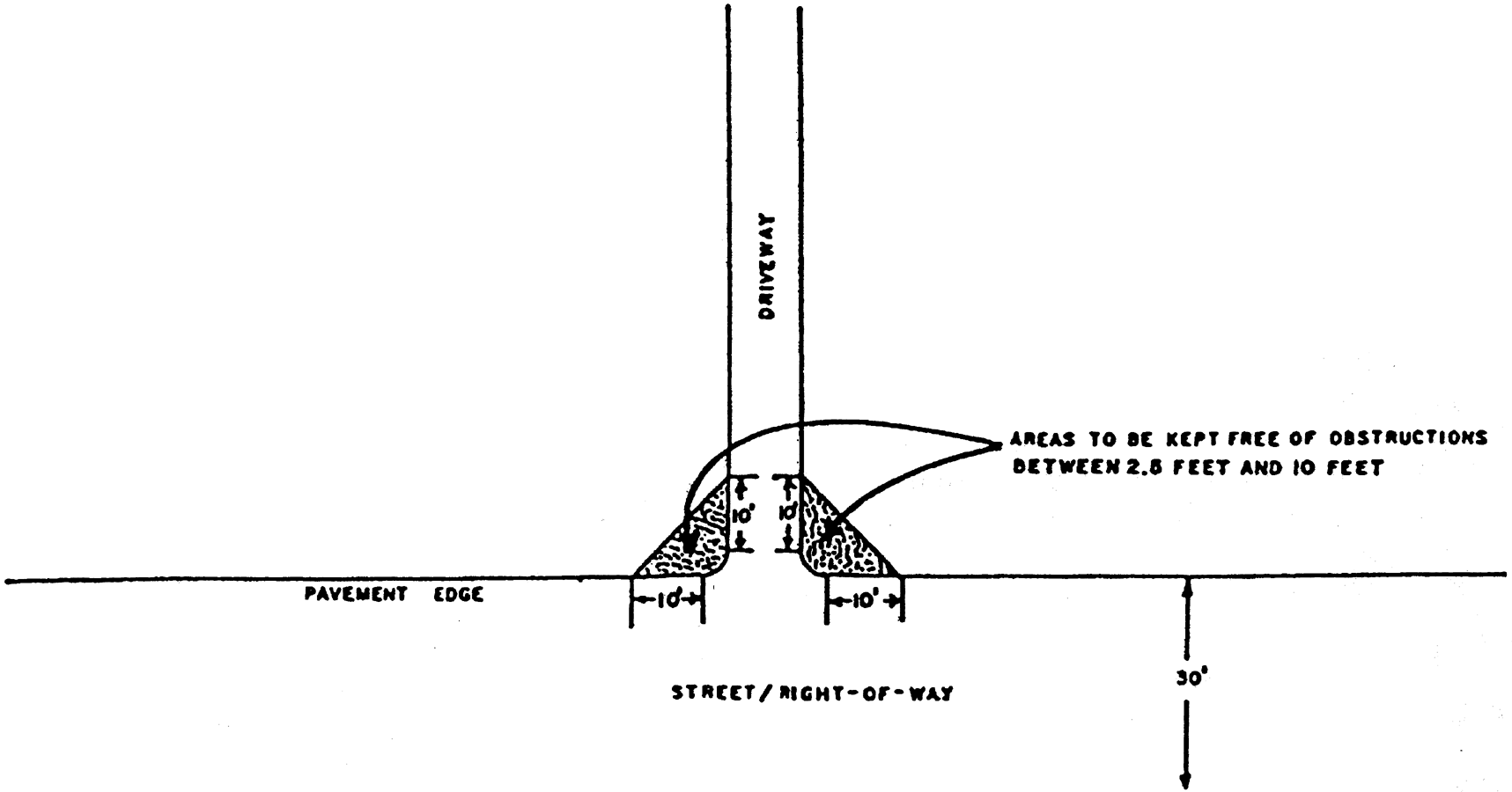 At single-family and duplex residential entrances. Visibility clearance shall also be required at all entrances onto public or private streets from driveways in single-family (including driveways within single-family condominium developments) and duplex dwelling units, provided that the two equal sides of the triangle forming this visibility clearance area may be ten (10) feet in length, rather than the longer distances required for other entrances.