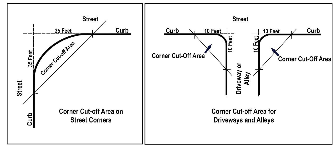 Corner Cutoff Areas. The following regulations shall apply at all intersections of streets, alleys or private driveways in all residential districts in order to provide adequate visibility for vehicular traffic. There shall be no visual obstruction within the cutoff areas established herein.