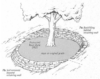 Wells or retaining walls around the CRZ will be used if proposed finished grades will raise or lower the natural CRZ grade by more than 6 inches.
