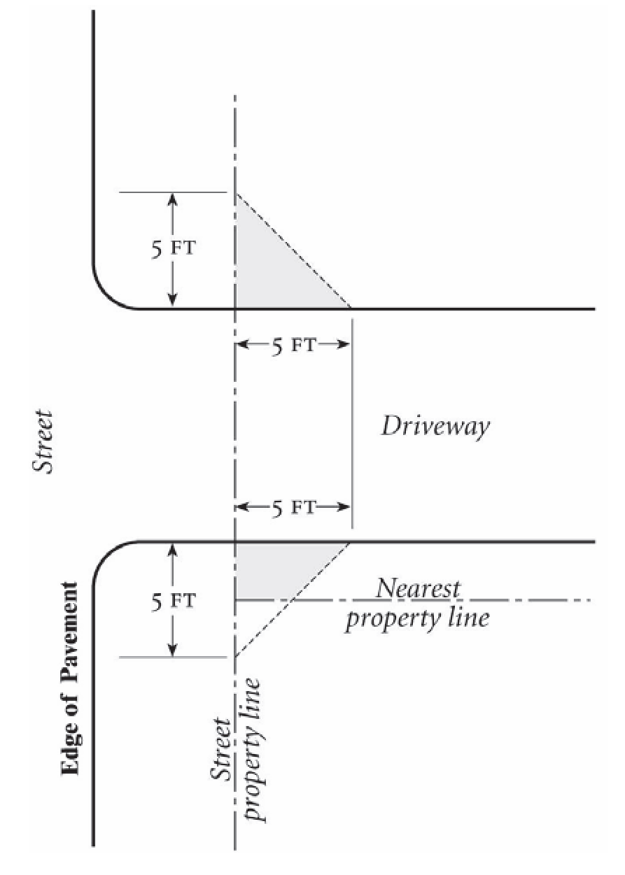 Driveway Visibility. Visibility from a driveway may not be blocked between a height of three feet and seven feet for a depth of five feet from the street property line and five feet from the edge of the driveway or at the nearest property line intersecting the street property line, whichever is less. Refer to Figure 1425-35.