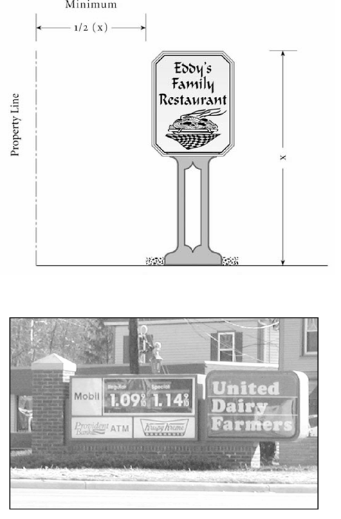 A ground sign may not be closer to a lot line or right-of-way than the greater of one-half the sign height or 15' when within a sight triangle. Refer to Figures 1427-25-A and 1427-25-C.
