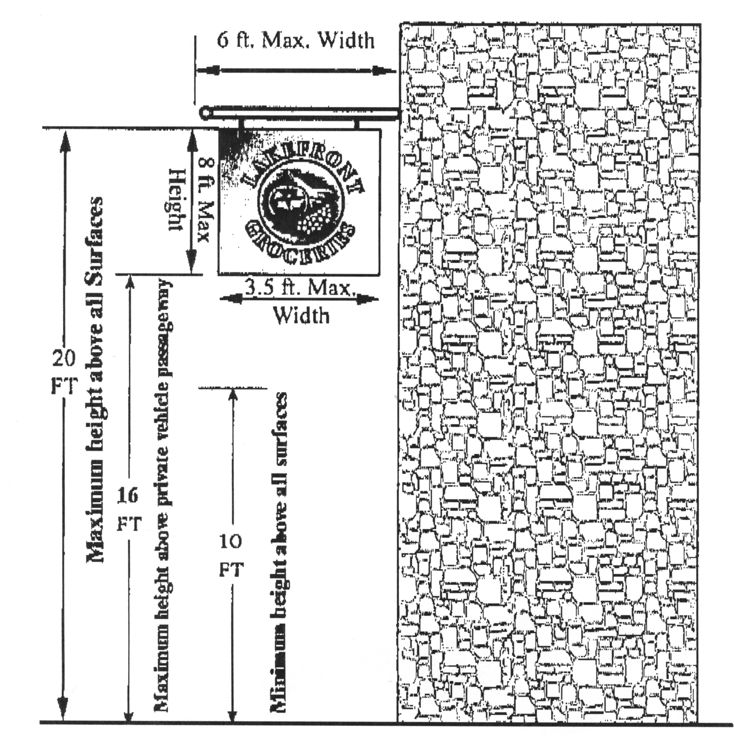 A projecting sign must be at least ten feet above the surface over which it projects, or at least 16 feet above a private vehicular passageway.