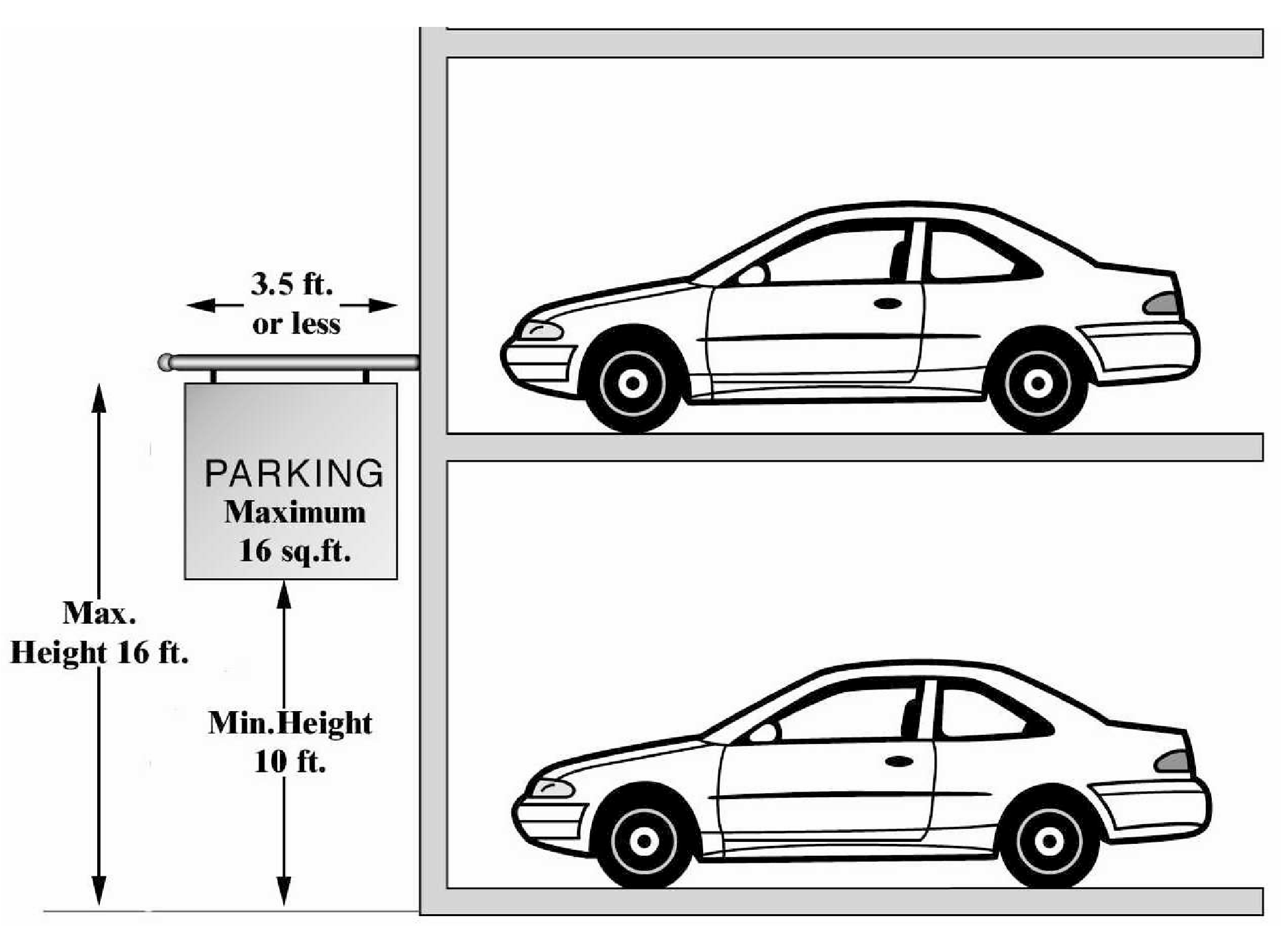 Parking Identification Signs. Parking identification signs may be erected at every entrance and may be internally illuminated, provided the area of any sign face may not exceed 16 square feet. For parking lots, signs may be erected as a ground or wall sign. For parking garages, signs may be erected as a wall sign or projecting sign. The height of any sign may be no less than ten feet above street grade and may not exceed 16 feet above street grade. The maximum width of a projecting parking identification sign may not exceed 3.5 feet. Refer to Figure 1411-35-A.