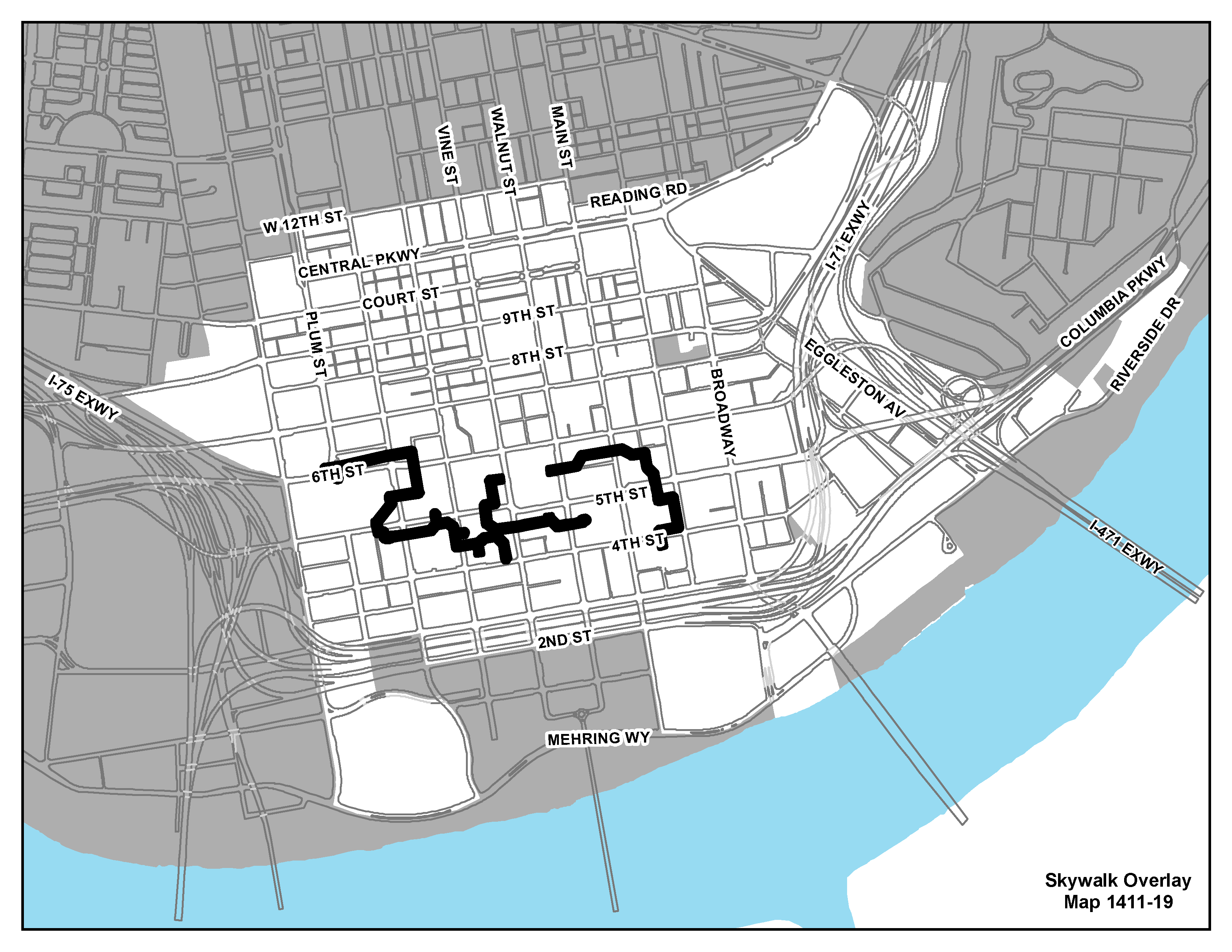 Map 1411-19: Skywalk Overlay in Downtown Development Districts shows the existing skywalk system as well as locations for extensions.