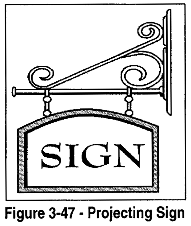 Projecting and suspended signs. The following standards apply to projecting signs (Figure 3-47) in all zoning districts where allowed by Section 106.38.060 (Zoning District Sign Standards):