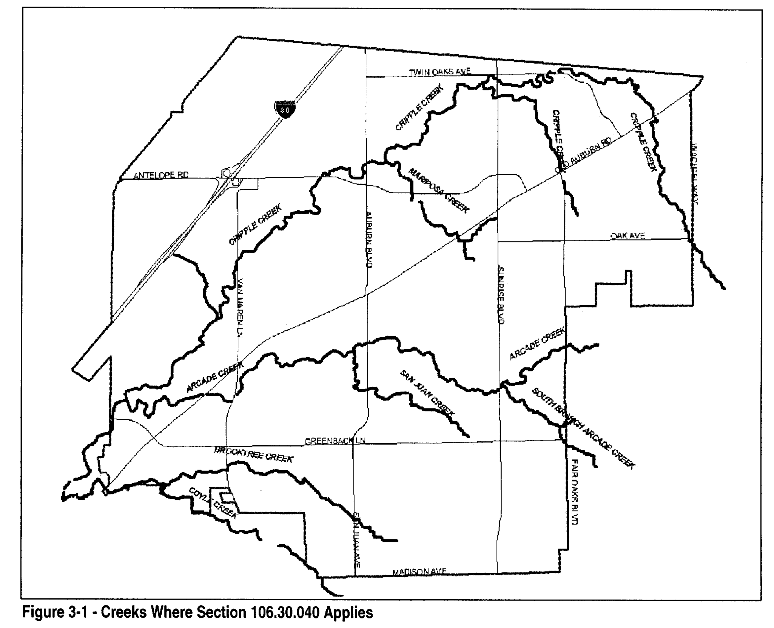 Public access and visibility to creeks should be provided, if feasible, through the use of single-loaded frontage roads adjacent to creeks, but outside of the creek setback. Structures or lots that back-up to creeks or creek frontage roads are discouraged.