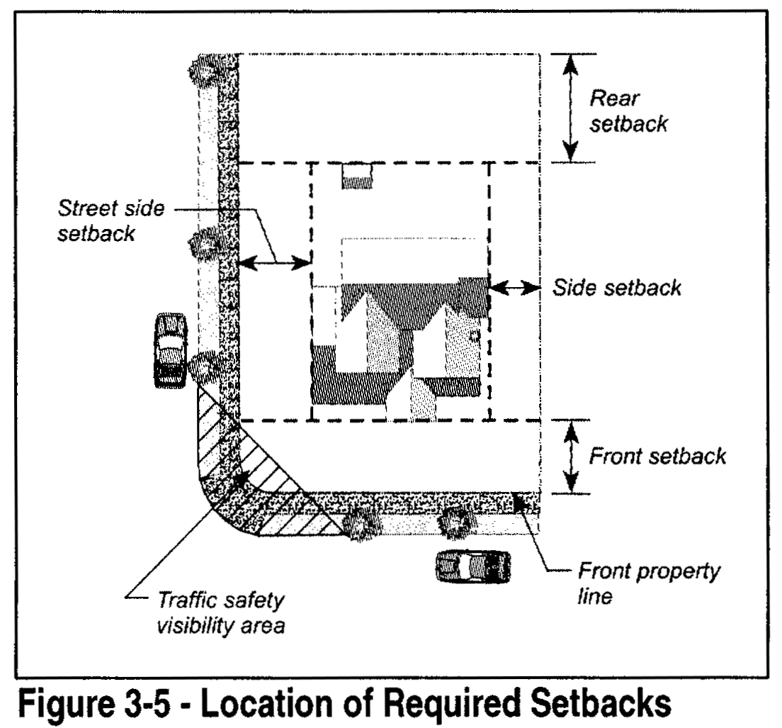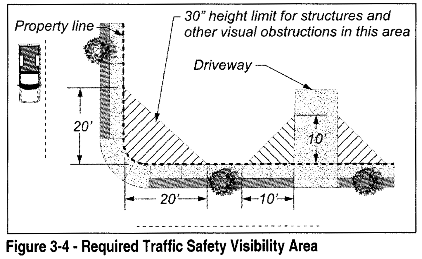 Height limit at street corners. Development proposed adjacent to any public or private street, or an alley intersection, shall be designed to provide a traffic safety visibility area for pedestrian and traffic safety. See Figure 3-4.