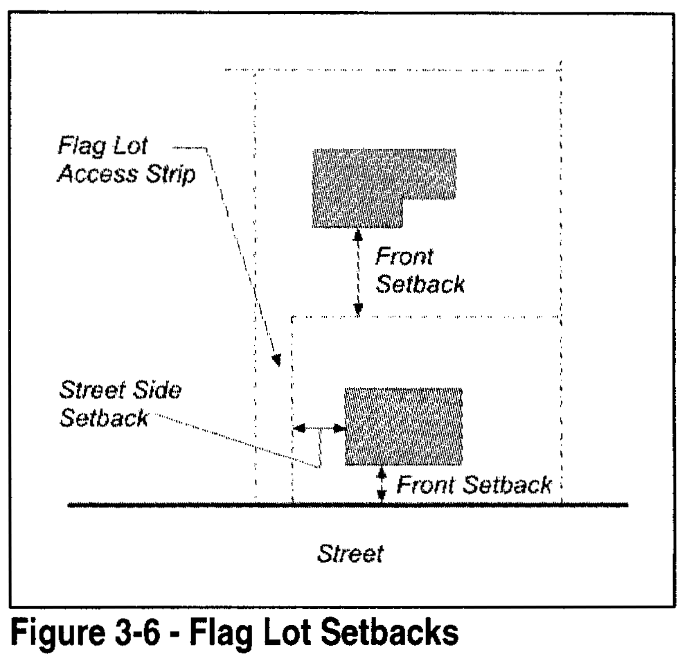 Flag lot. The front setback on a flag-shaped lot shall be measured from the nearest point of the wall of the structure to the property line intersected by the access strip, establishing a setback line parallel to the property line nearest to the public street or right-of-way; except that any fencing proposed along the access strip shall comply with the setback requirements applicable to the adjacent parcels. See Figure 3-6.