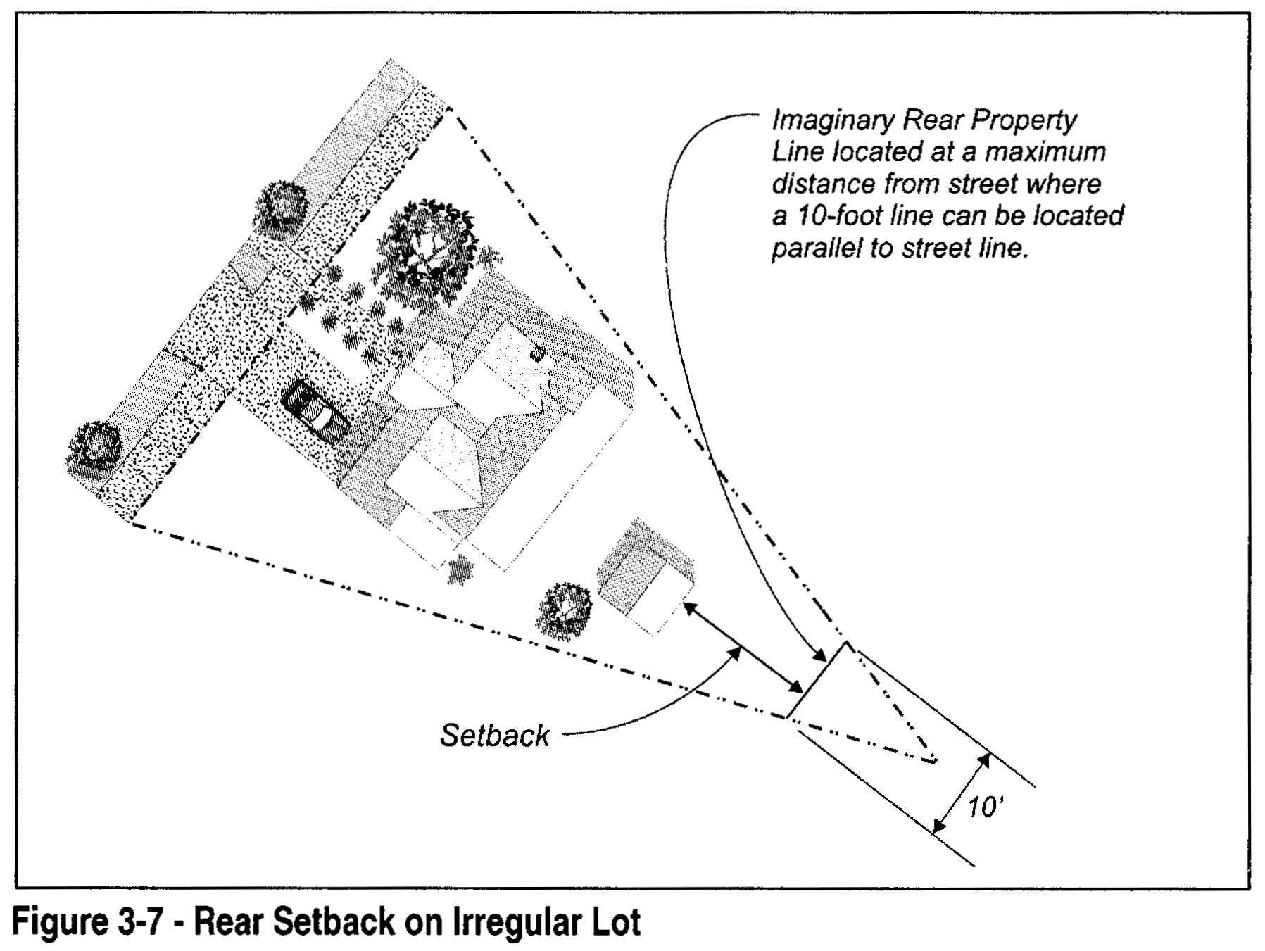 Where a parcel has no rear property line because its side property lines converge to a point, an assumed line 10 feet long within the parcel, parallel to and at a maximum distance from the front property line, shall be deemed to be the rear property line for the purpose of determining the depth of the required rear yard. See Figure 3-7.