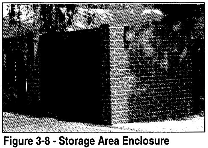 Enclosure requirements. Each storage area shall be fully enclosed by a six-foot high masonry wall or other solid enclosure that is architecturally compatible with adjacent structures. See Figure 3-8.