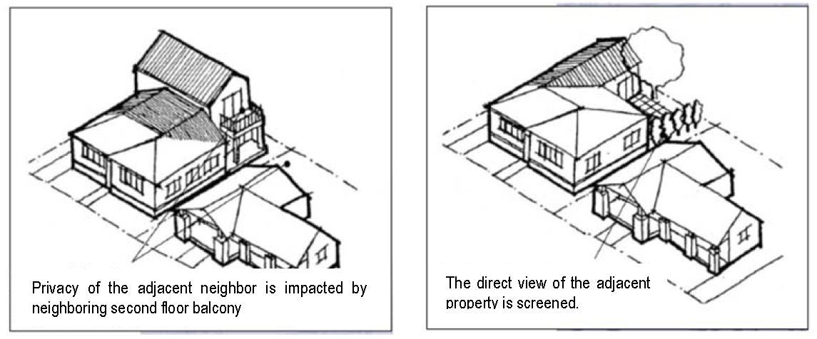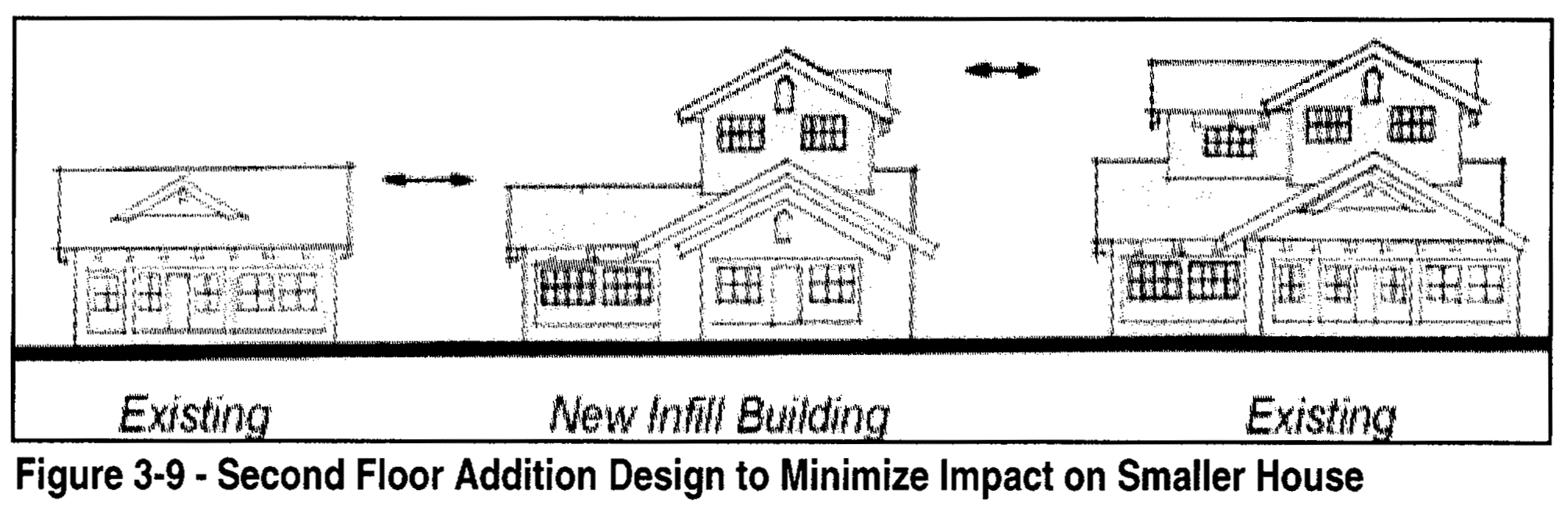 Visual impacts from building height. The height of new buildings should be consistent with asurrounding residential structures. Where greater height is desired, a second story addition to an existing structure, and/or a new two-story structure should be designed to set back upper floors from the edge of the first story to reduce their visual impact on adjacent smaller homes. See Figure 3-9.