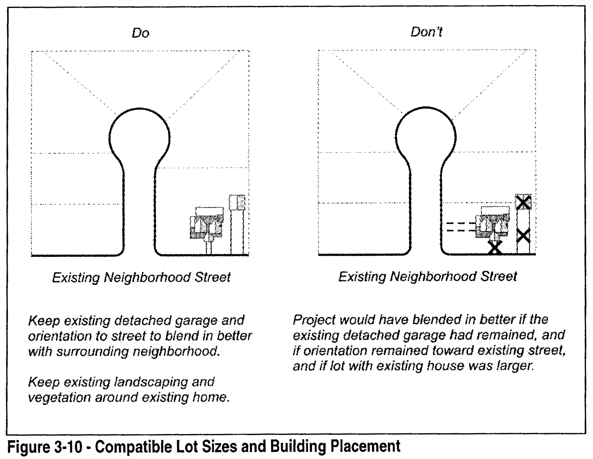 General principles. New residential development should be compatible in scale, siting, detailing, and overall character with adjacent buildings and those in the immediate neighborhood, unless the review authority determines that proposed development represents a desirable improvement over existing character. This is crucial when a new or remodeled house is proposed to be substantially larger than others in the neighborhood. When new homes are developed adjacent to older ones, the height and bulk of the new construction can have a negative impact on adjacent, smaller scale buildings.