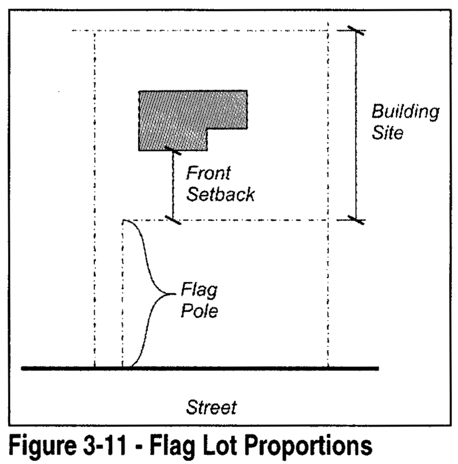 Where the review authority determines that a flag lot or access easement is appropriate, the easement or lot "flag pole" should be no longer than 1.5 times the depth of the building site being accessed. Neither a flag pole or an easement that provides parcel access shall be counted when determining compliance with the minimum lot area requirements of the applicable zoning district.