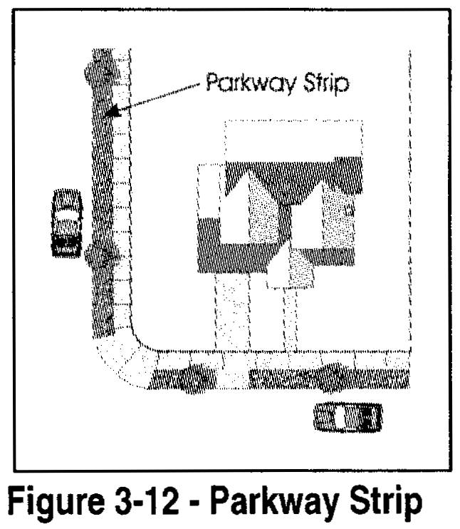 Parkway/planting strips. Sidewalks should be separated from curbs by parkway strips of at least five feet in width, where feasible. Parkways should be planted with canopy trees at an interval appropriate to the species of the selected street tree that will produce a continuously shaded sidewalk. Parkways should also be planted with non-turf ground covers or other plant materials that will withstand pedestrian traffic. Turf is not permitted in parkways.