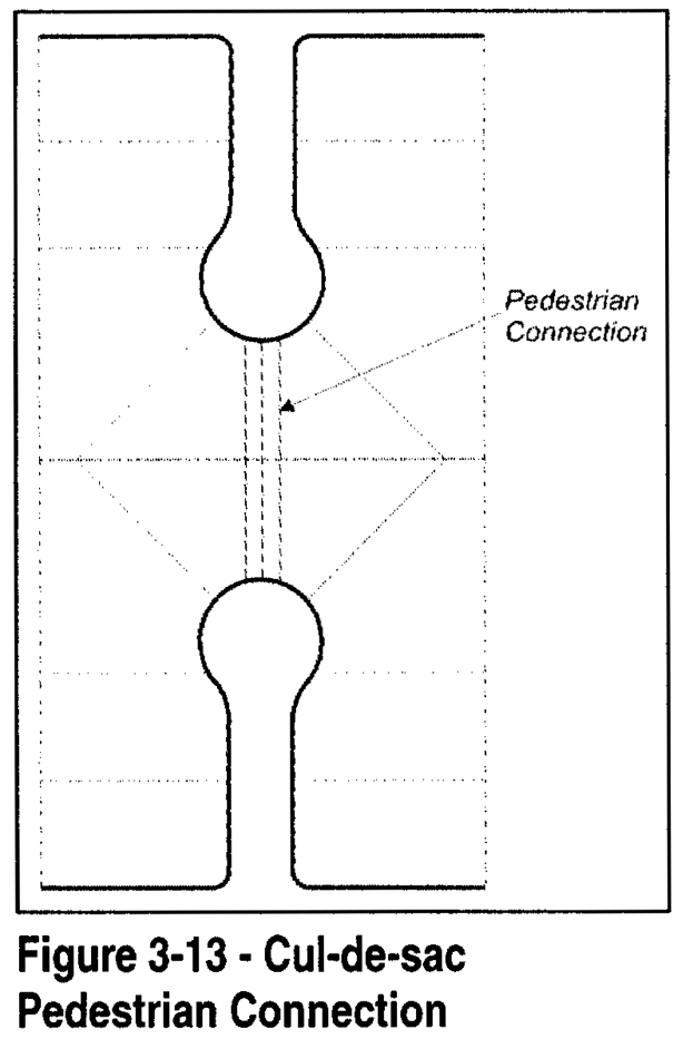 If the review authority determines that cul-de-sacs are necessary, the end of each cul-de-sac should provide a pedestrian walkway and bikeway between private parcels to link with an adjacent cul-de-sac, street, and/or park, school, or open space area.