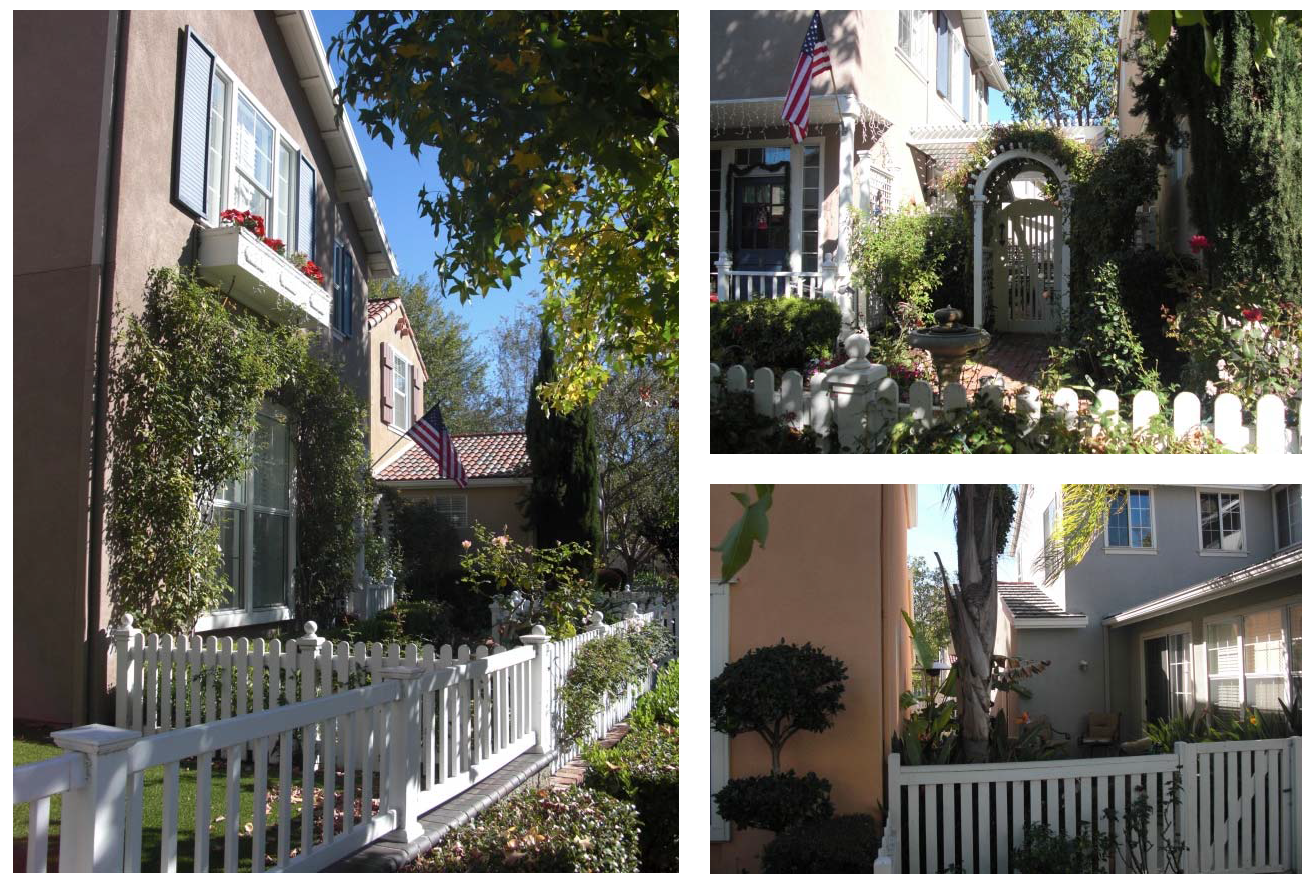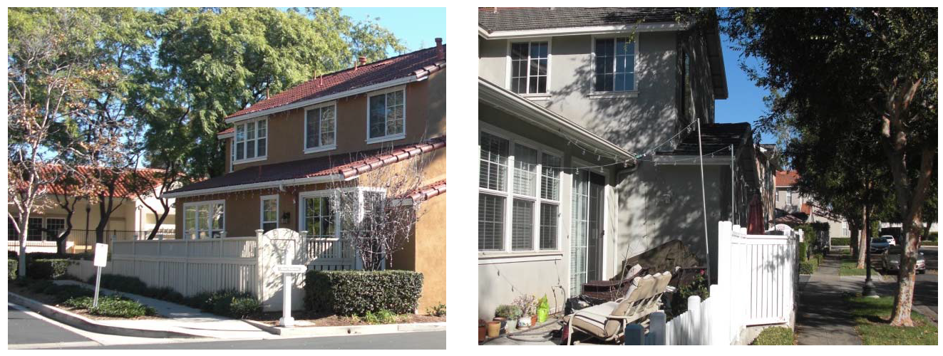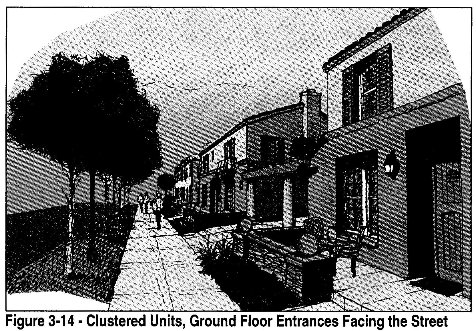 Lower density multi-unit projects should be designed as "walk-up" rather than "stacked" units, with each unit adjacent to a street having its primary pedestrian entrance from the street sidewalk. Higher density projects should be designed either with ground floor units having individual sidewalk entrances, or as courtyard projects with at least one significant pedestrian entrance from the street sidewalk. Where individual units have access to the street sidewalk, private "front yard" outdoor space may be differentiated from the public right-of-way by a porch, or small yard enclosed by a low fence. See Figure 3-14.
