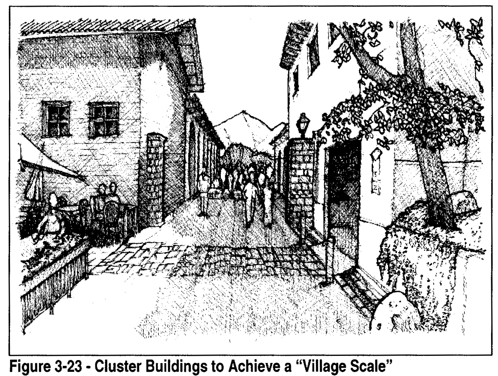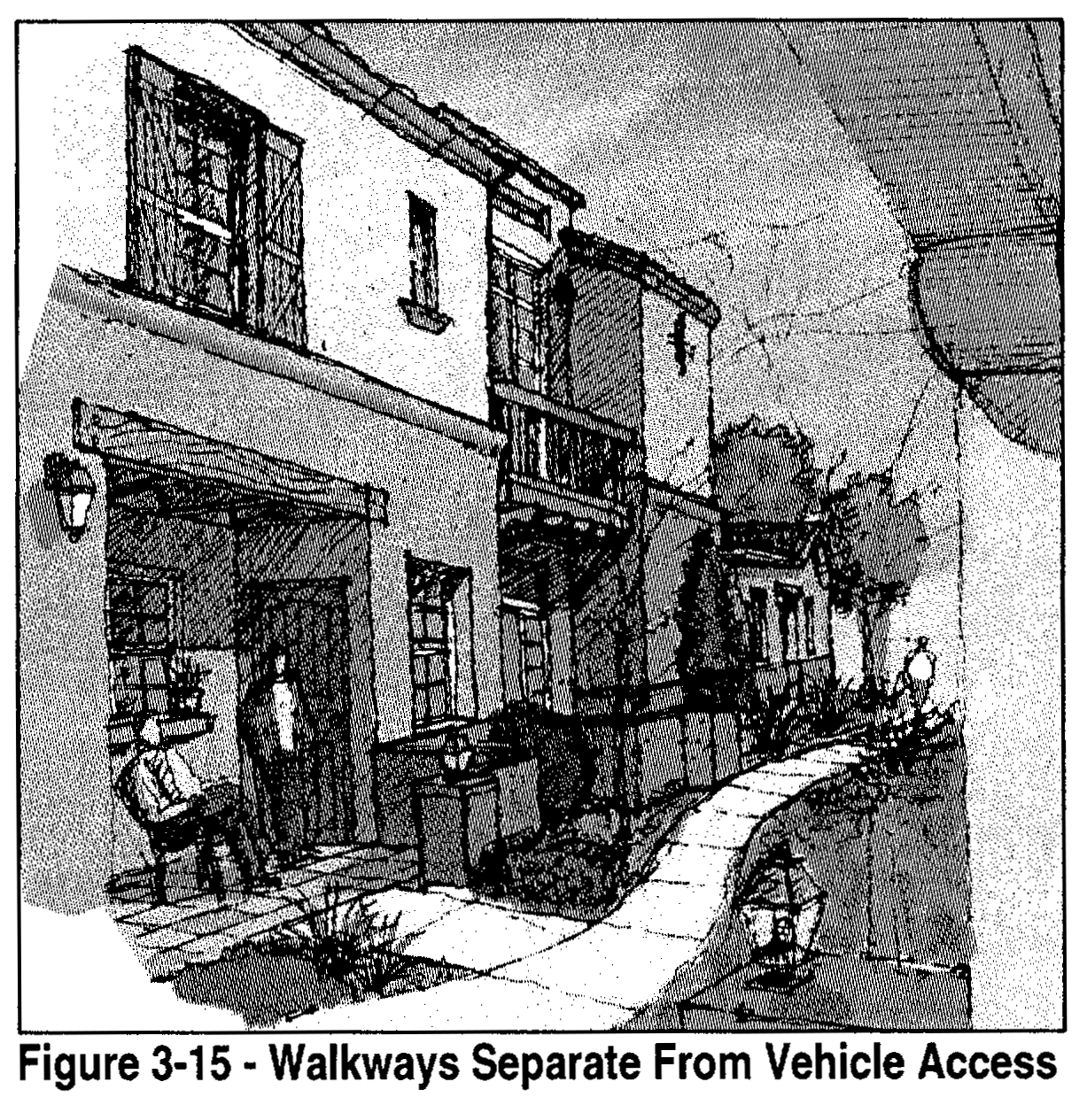 Residential units and activity areas not adjacent to a street should be accessible via pedestrian walkways and bikeways separate from vehicle parking areas and driveways. See Figure 3-15.