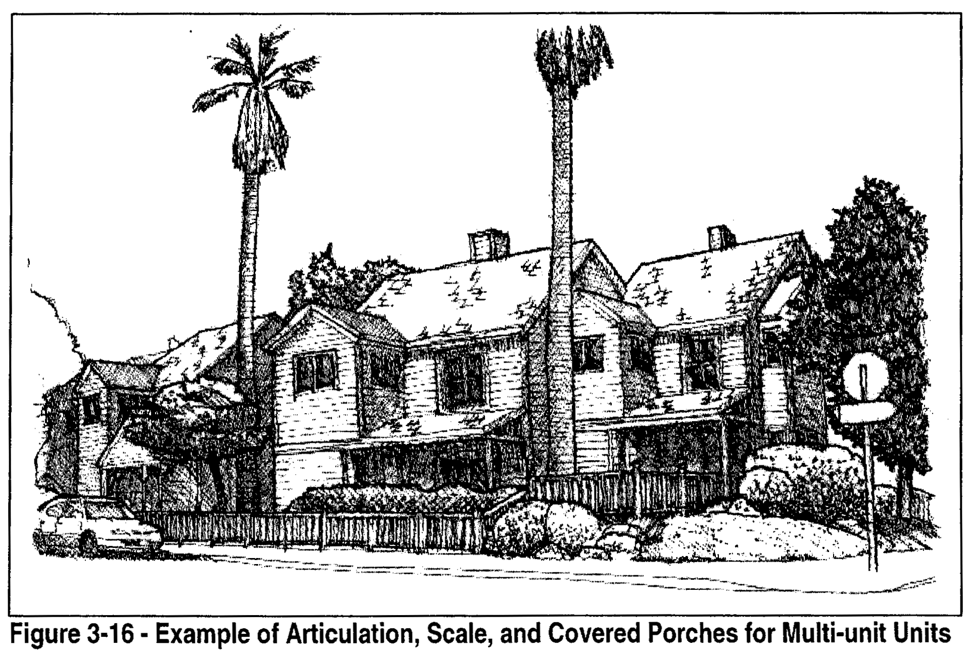Balconies, porches, and patios. The use of balconies, porches, and patios as part of multi-family structures is encouraged for both practical and aesthetic value. These elements should be used to break up large wall masses, offset floor setbacks, and add human scale to structures. Individual unit entrances within a multi-unit project should have individual covered porches. See Figure 3-16.