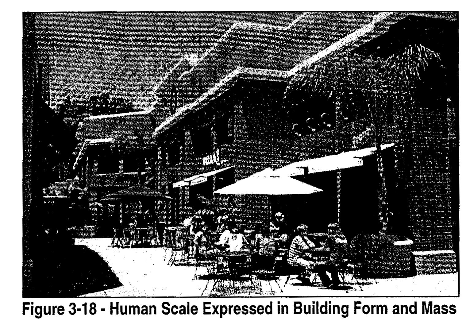 Building setbacks should be provided proportionate to the scale of the structure and in consideration of existing adjacent development. Larger structures require more setback area for a balance of scale and so as not to impose visually on neighboring uses.