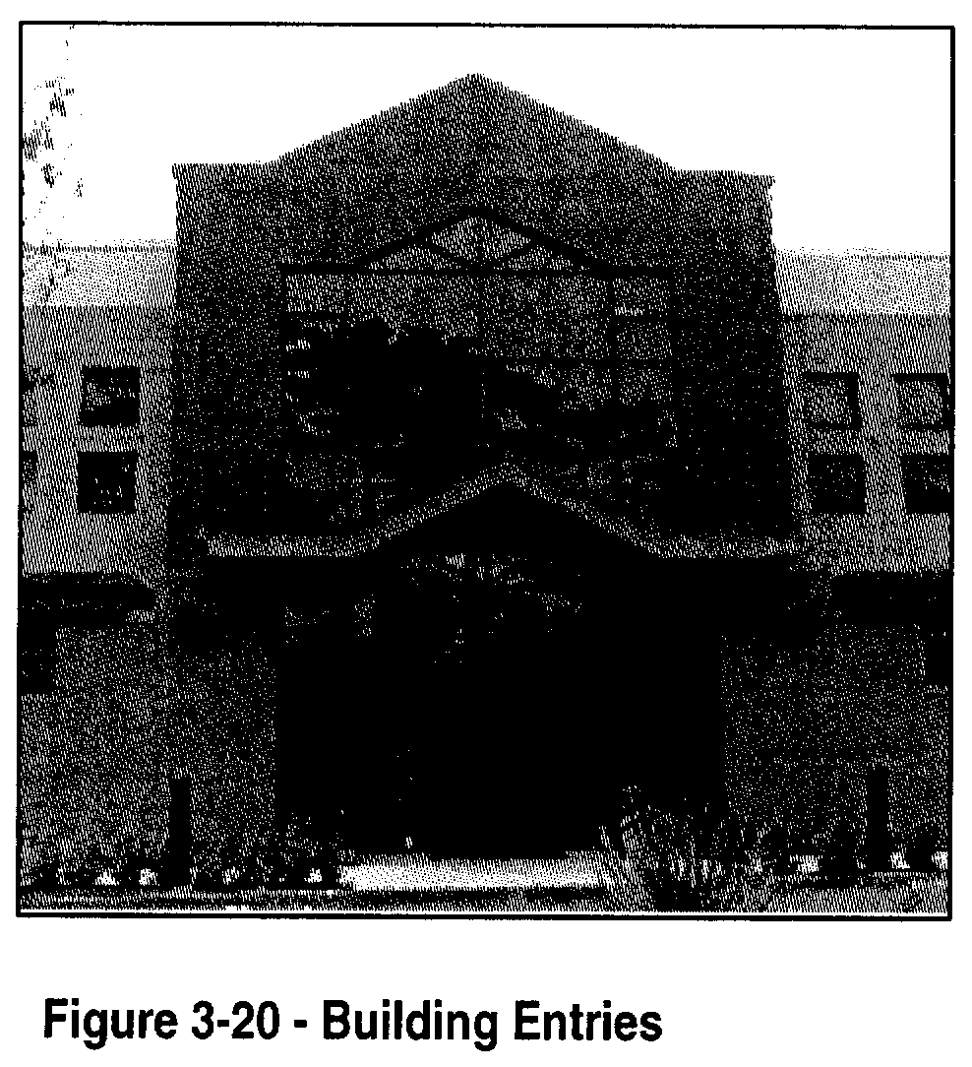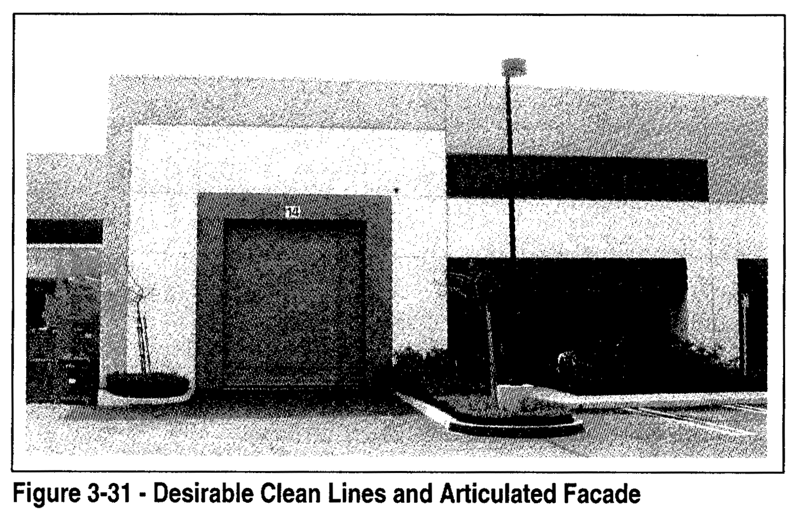 Architectural style. The architectural style of business park and industrial buildings should incorporate clean simple lines. Buildings should project an image of high quality through the use of appropriate durable materials and well landscaped settings. See Figure 3-31.