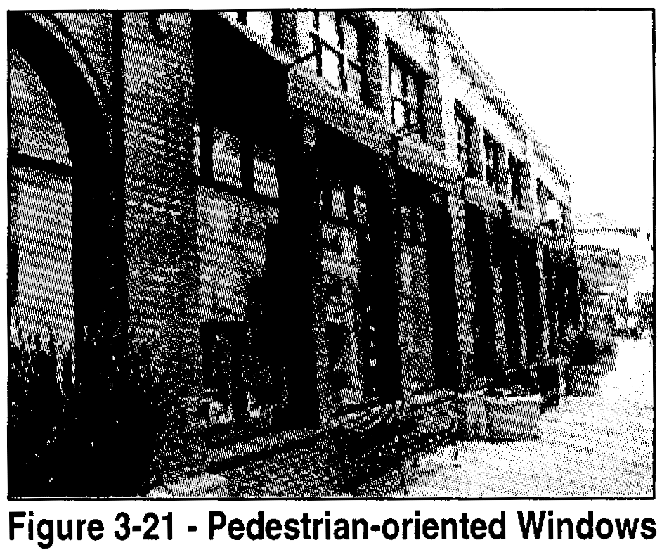 Fuel pump islands and canopies should be screened by the main building structure. The retail market/office building should be placed at the street frontage with a pedestrian entrance from, and display windows along the sidewalk, to encourage pedestrian use.