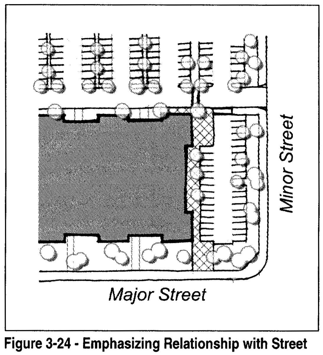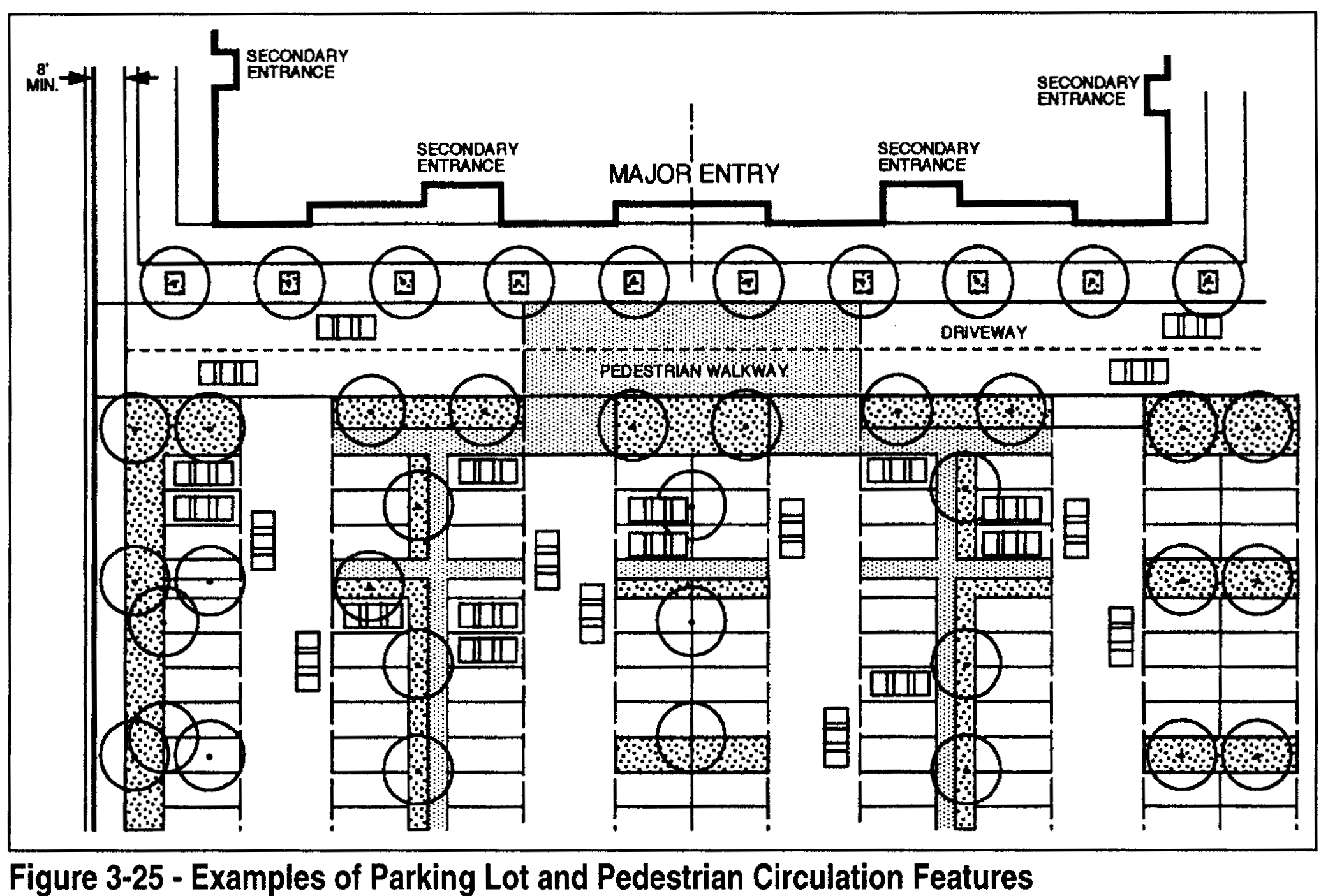 Parking and vehicle circulation. Parking lots should not be the dominant visual elements of a site. Large expansive paved areas located between the street and the building are to be avoided in favor of smaller multiple lots separated by landscaping and buildings and located to the sides and rear of buildings whenever possible.