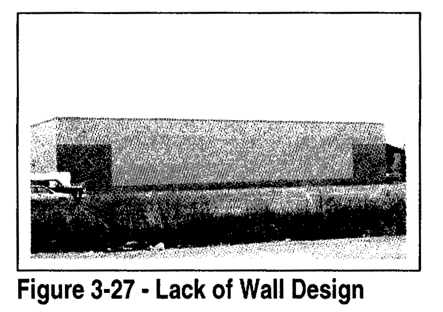 Mass and scale of structures. As a category of structure type, typically bland industrial buildings often present unattractive, unadorned, "box-like" forms. A variety of design techniques should be used to help overcome this situation and to produce a cohesive design statement.
