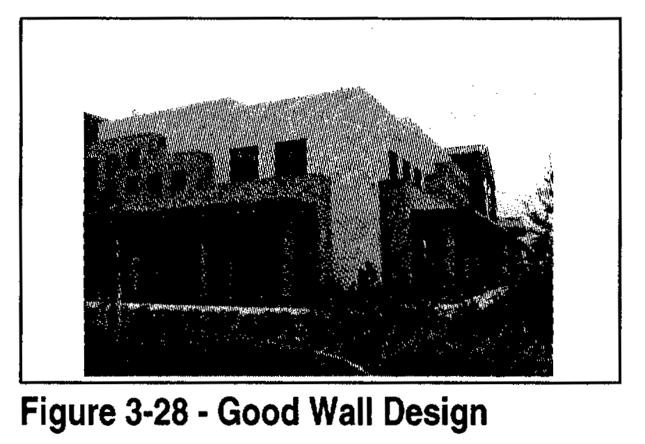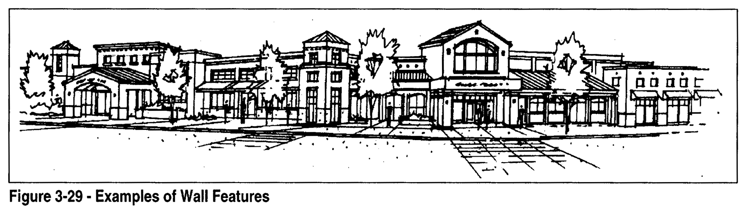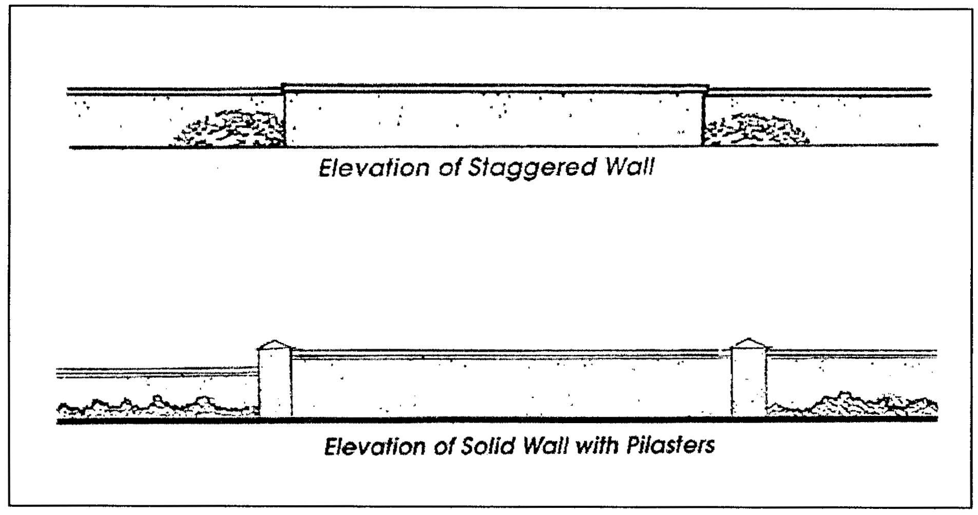 Long expanses of fence or wall surfaces should be offset and architecturally designed to prevent monotony. Landscape pockets should be provided along the wall. See Figure 3-32.