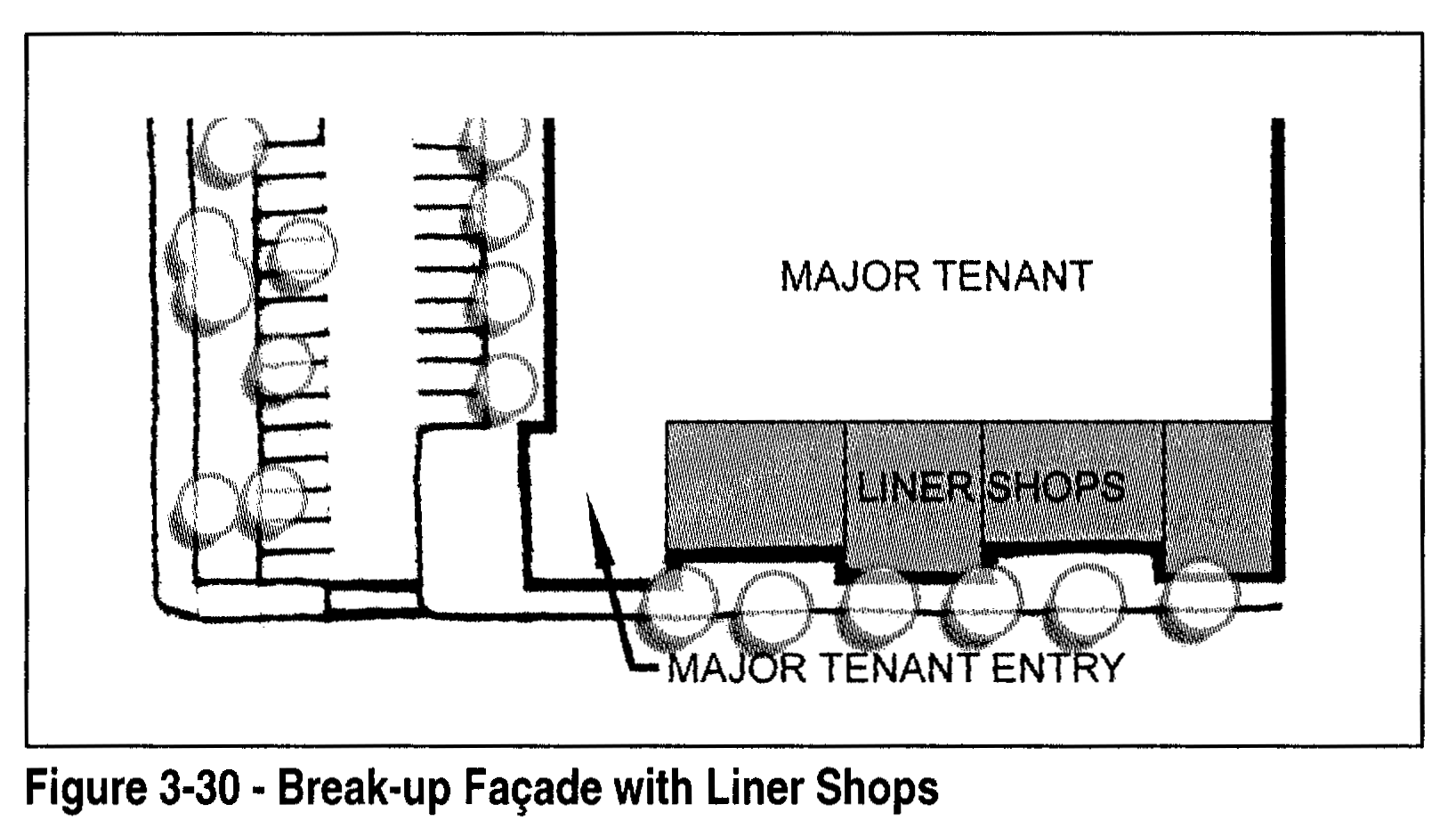 Long, monotonous parking drives and large, undivided parking lots are discouraged.